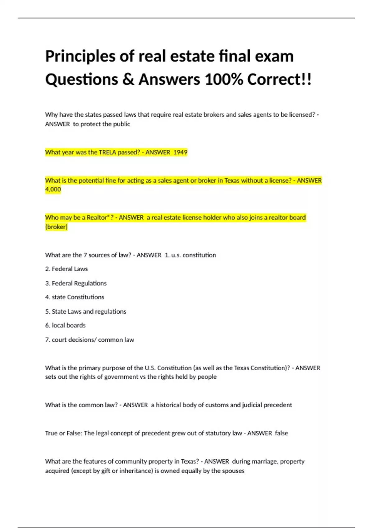 Why have the states passed laws that require real estate brokers and sales agents to be licensed? - ANSWER to protect the public What year was the TRELA passed? - ANSWER 1949 What is the potential fine for acting as a sales agent or broker in Texas without a license? - ANSWER 4,000 Who may be a Realtor®? - ANSWER a real estate license holder who also joins a realtor board (broker) What are the 7 sources of law? - ANSWER 1. u.s. constitution 2. Federal Laws 3. Federal Regulations 4. state Constitutions 5. State Laws and regulations 6. local boards 7. court decisions/ common law What is the primary purpose of the U.S. Constitution (as well as the Texas Constitution)? - ANSWER sets out the rights of government vs the rights held by people What is the common law? - ANSWER a historical body of customs and judicial precedent True or False: The legal concept of precedent grew out of statutory law - ANSWER false What are the features of community property in Texas? - ANSWER during marriage, property acquired (except by gift or inheritance) is owned equally by the spouses