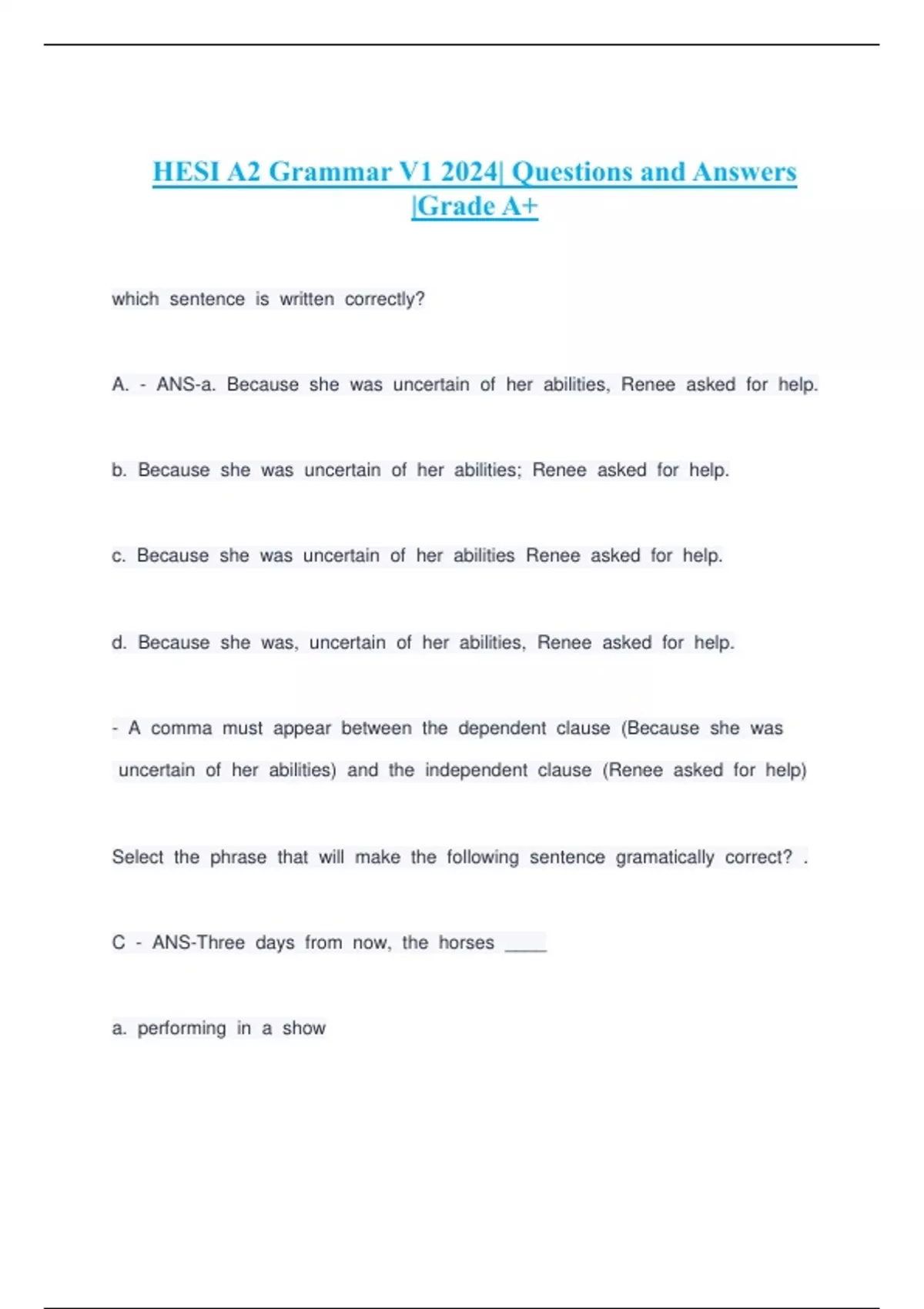 HESI A2 Grammar V1 2024| Questions and Answers