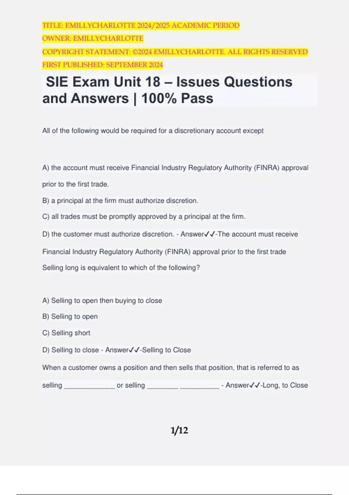 SIE Exam Unit 18 – Issues Questions and Answers | 100% Pass All of the following would be required for a discretionary account except A) the account must receive Financial Industry Regulatory Authority (FINRA) approval prior to the first trade. B) a principal at the firm must authorize discretion. C) all trades must be promptly approved by a principal at the firm. D) the customer must authorize discretion. - Answer️️ -The account must receive Financial Industry Regulatory Authority (FINRA) approval prior to the first trade Selling long is equivalent to which of the following? A) Selling to open then buying to close B) Selling to open C) Selling short D) Selling to close - Answer️️ -Selling to Close When a customer owns a position and then sells that position, that is referred to as selling _____________ or selling ________ __________ - Answer️️ -Long, to Close TITLE: EMILLYCHARLOTTE 2024/2025 ACADEMIC PERIOD OWNER: EMILLYCHARLOTTE COPYRIGHT STATEMENT: ©2024 EMILLYCHARLOTTE. ALL RIGHTS RESERVED FIRST PUBLISHED: SEPTEMBER 2024 2/12 When a customer _______________ a position and then ______________ that position, that is referred to as selling long or selling to close - Answer️️ -Owns, Sells All of the following are required for a discretionary account except A) all trades must be promptly approved by a principal at the firm. B) the customer must authorize discretion. C) a principal at the firm must authorize discretion. D) the account must receive FINRA approval prior to the first trade. - Answer️️ -The account must receive FINRA approval prior to first trade Short sellers have A) limited profit and loss potential. B) unlimited profit and loss potential. C) limited profit potential and an unlimited loss potential. D) unlimited profit potential and limited loss potential. - Answer️️ -Limited profit potential and unlimited loss potential Short sellers are _______________ - Answer️️ -Bearish Because stock could only go down as far as zero, the profit for a ________________ _________________ is limited to the difference between the price the stock was shorted at and zero - Answer️️ -Short Seller TITLE: EMILLYCHARLOTTE 2024/2025 ACADEMIC PERIOD OWNER: EMILLYCHARLOTTE COPYRIGHT STATEMENT: ©2024 EMILLYCHARLOTTE. ALL RIGHTS RESERVED FIRST PUBLISHED: SEPTEMBER 2024 3/12 Meeting the location requirements and the borrowing of securities when a customer wants to sell short is done by A) the customer who wants to sell short. B) the purchaser of the securities being sold short. C) the customer or entity that the shares will be borrowed from. D) the broker-dealer on behalf of the short-selling customer. - Answer️️ -The broker dealer on behalf of the short selling customer Meeting the location requirements and the borrowing of securities is done by the back office of the _______________ ________________ on behalf of the short-selling customer. - Answer️️ -Broker Dealer Which of the following transactions has the least risk? A) Buying to open B) Selling short C) Short against the box D) Selling to open - Answer️️ -Short against the box Position that is created when an investor creates a short stock position (sells short) while also holding the shares long - Answer️️ -Short Against the Box The locate requirement is an element of which of the following transactions? TITLE: EMILLYCHARLOTTE 2024/2025 ACADEMIC PERIOD OWNER: EMILLYCHARLOTTE COPYRIGHT STATEMENT: ©2024 EMILLYCHARLOTTE. ALL RIGHTS RESERVED FIRST PUBLISHED: SEPTEMBER 2024 4/12 A) Sell to close B) Buy to open C) Sell to open D) Buy to close - Answer️️ -Sell to Open When _________________ ______________ shares must be borrowed from the dealer. - Answer️️ -Selling Short When ____________________ to __________________ shares must be borrowed from the dealer. - Answer️️ -Selling, Open The trade would need to be placed in a discretionary account if the registered representative chooses which of the following? I. The time of execution of the trade II. Which security to buy III. How much of the security to buy IV At what price to execute the trade A) I and II B) II and IV C) II and III D) I and IV - Answer️️ -II & III TITLE: EMILLYCHARLOTTE 2024/2025 ACADEMIC PERIOD OWNER: EMILLYCHARLOTTE COPYRIGHT STATEMENT: ©2024 EMILLYCHARLOTTE. ALL RIGHTS RESERVED FIRST PUBLISHED: SEPTEMBER 2024 5/12 If the registered representative chooses the asset, the action, or the amount, it must be placed in a _________________ account - Answer️️ -Discretionary Which of the following would be required in discretionary accounts? A) Prompt approval by a principal following each discretionary trade B) Securities and Exchange Commission (SEC) approval to open the account C) Financial Industry Regulatory Authority (FINRA) approval to open the account D) Prior approval by a principal before each discretionary trade is placed - Answer️️ - Prompt approval by a principal following each discretionary trade A customer who is short against the box may close the position by all the following except A) covering the short with the stock in his acco