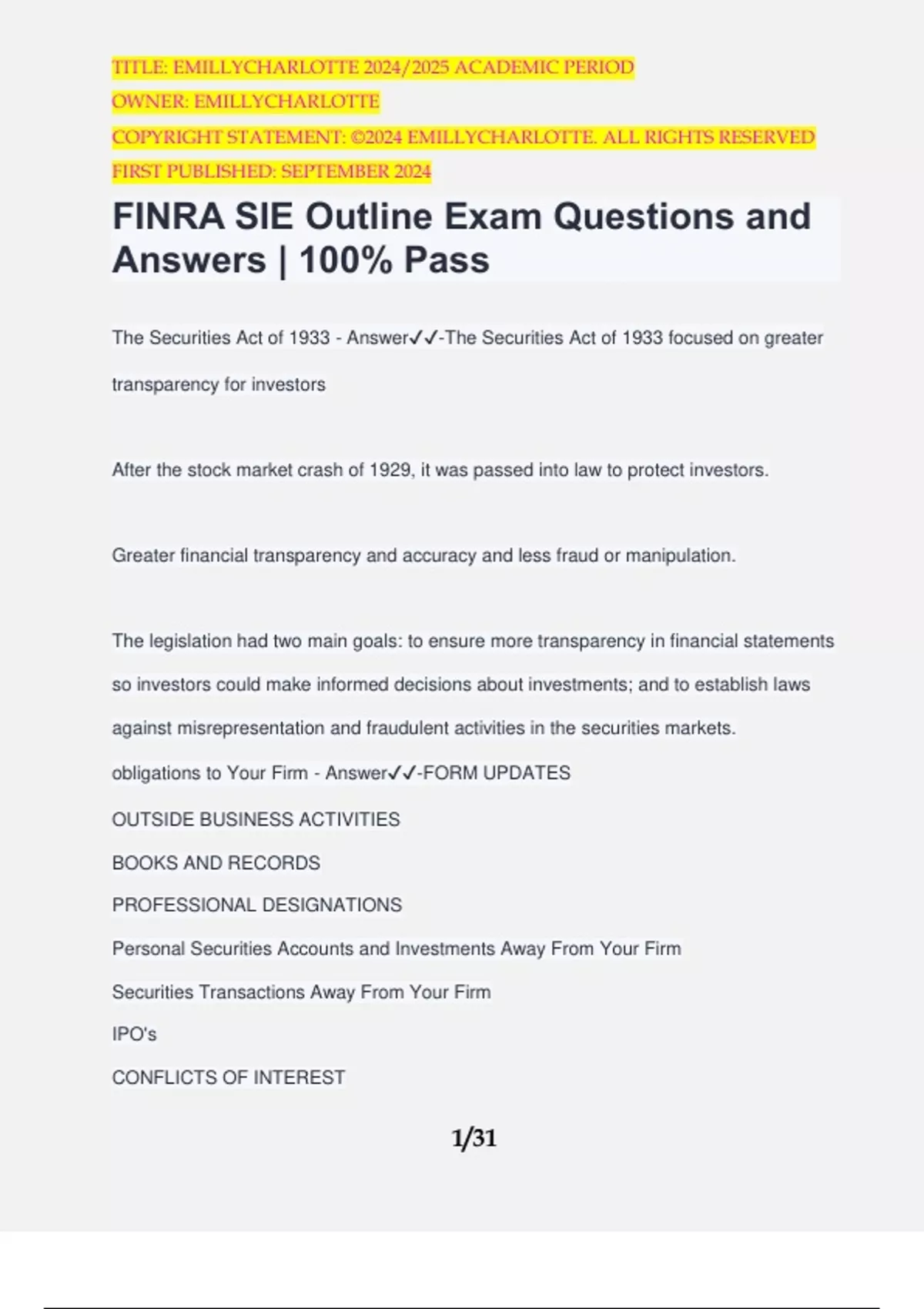 FINRA SIE Outline Exam Questions and Answers | 100% Pass The Securities Act of 1933 - Answer️️ -The Securities Act of 1933 focused on greater transparency for investors After the stock market crash of 1929, it was passed into law to protect investors. Greater financial transparency and accuracy and less fraud or manipulation. The legislation had two main goals: to ensure more transparency in financial statements so investors could make informed decisions about investments; and to establish laws against misrepresentation and fraudulent activities in the securities markets. obligations to Your Firm - Answer️️ -FORM UPDATES OUTSIDE BUSINESS ACTIVITIES BOOKS AND RECORDS PROFESSIONAL DESIGNATIONS Personal Securities Accounts and Investments Away From Your Firm Securities Transactions Away From Your Firm IPO's CONFLICTS OF INTEREST TITLE: EMILLYCHARLOTTE 2024/2025 ACADEMIC PERIOD OWNER: EMILLYCHARLOTTE COPYRIGHT STATEMENT: ©2024 EMILLYCHARLOTTE. ALL RIGHTS RESERVED FIRST PUBLISHED: SEPTEMBER 2024 2/31 GIFTS AND GRATUITIES ADVERTISING REQUIREMENTS Forms U4 & U5 - Answer️️ -You are responsible for ensuring that all updates to your Form U4 are accurate, timely and provided to your firm. The FINRA By-Laws also require firms to file a Form U5 within 30 days of your termination from the firm and to provide you with a copy of the filing. In addition, if the firm learns of any facts or circumstances that make the previously filed U5 inaccurate or incomplete, the firm is required to amend the filing at that time and provide you with a copy. Outside Business Activities - Answer️️ -During your association with a firm you may not be an employee, independent contractor, sole proprietor, officer, director or partner of another person as a result of any business activity outside the scope of the relationship with your firm, unless you have provided prior written notice to your firm pursuant to FINRA Rule 3270. Accordingly, you should discuss with your supervisor any offer to work part-time or off-hours with any other business concern or receipt of any form of compensation from a source other than your firm. Your firm must evaluate your proposed outside business activities to determine whether to impose conditions, limit or TITLE: EMILLYCHARLOTTE 2024/2025 ACADEMIC PERIOD OWNER: EMILLYCHARLOTTE COPYRIGHT STATEMENT: ©2024 EMILLYCHARLOTTE. ALL RIGHTS RESERVED FIRST PUBLISHED: SEPTEMBER 2024 3/31 even prohibit your proposed activity because such activity may interfere with your role at the firm or be perceived by customers as part of the firm's business. Books and Records - Answer️️ -As a registered representative, your work-related documents, such as correspondence with customers, new account forms and copies of customer statements and customer complaints must be reviewed and retained by your firm in specific ways according to FINRA Rule 4510 and other rules (e.g. FINRA rules 4511, 4512, 4513, 4514, and 4515). Regardless of the name on the incoming envelope, these documents are also the property of the firm. Professional Designations - Answer️️ -FINRA Rule 2210 prohibits brokerage firms and brokers registered with FINRA from referencing legitimate degrees or designations in a misleading manner or referencing non-existent or self-conferred degrees/designations. FINRA's page on Understanding Professional Designations will help you learn more TITLE: EMILLYCHARLOTTE 2024/2025 ACADEMIC PERIOD OWNER: EMILLYCHARLOTTE COPYRIGHT STATEMENT: ©2024 EMILLYCHARLOTTE. ALL RIGHTS RESERVED FIRST PUBLISHED: SEPTEMBER 2024 4/31 about professional designations generally while FINRA's Senior Designations page will help you learn more about designations relating to elderly investors. Personal Securities Accounts and Investments Away From