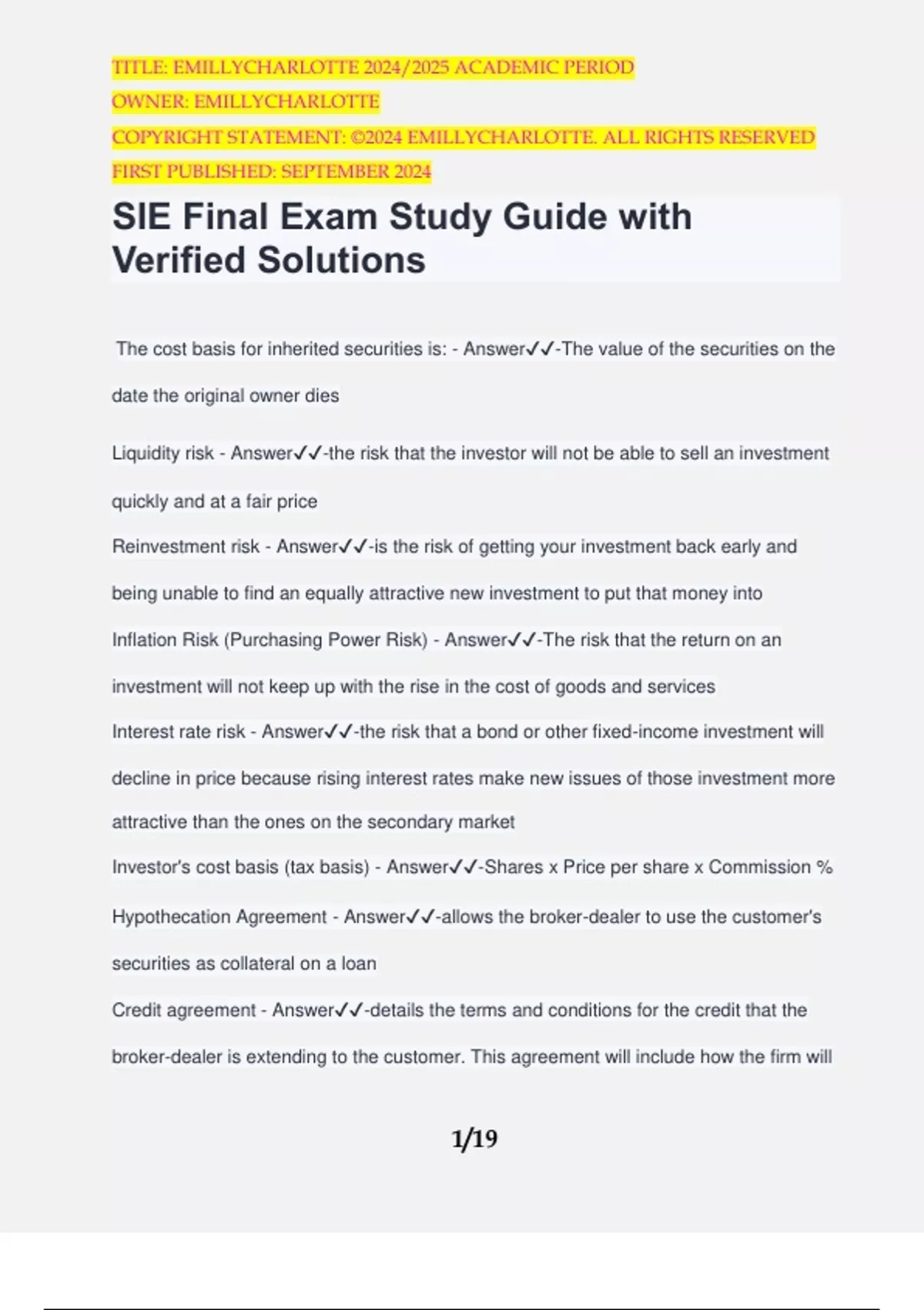 SIE Final Exam Study Guide with Verified Solutions The cost basis for inherited securities is: - Answer️️ -The value of the securities on the date the original owner dies Liquidity risk - Answer️️ -the risk that the investor will not be able to sell an investment quickly and at a fair price Reinvestment risk - Answer️️ -is the risk of getting your investment back early and being unable to find an equally attractive new investment to put that money into Inflation Risk (Purchasing Power Risk) - Answer️️ -The risk that the return on an investment will not keep up with the rise in the cost of goods and services Interest rate risk - Answer️️ -the risk that a bond or other fixed-income investment will decline in price because rising interest rates make new issues of those investment more attractive than the ones on the secondary market Investor's cost basis (tax basis) - Answer️️ -Shares x Price per share x Commission % Hypothecation Agreement - Answer️️ -allows the broker-dealer to use the customer's securities as collateral on a loan Credit agreement - Answer️️ -details the terms and conditions for the credit that the broker-dealer is extending to the customer. This agreement will include how the firm will TITLE: EMILLYCHARLOTTE 2024/2025 ACADEMIC PERIOD OWNER: EMILLYCHARLOTTE COPYRIGHT STATEMENT: ©2024 EMILLYCHARLOTTE. ALL RIGHTS RESERVED FIRST PUBLISHED: SEPTEMBER 2024 2/19 calculate the interest charged on the credit and what interest rate the loan rate it will be tied to Loan consent agreement - Answer️️ -permits the broker-dealer to lend the customer's securities to other customers wishing to execute short sales Which of the following private placement offerings has no dollar cap and allows for public advertising? - Answer️️ -A Regulation D, Rule 506(c) offering Consider the following bond notation: "IBM 5 3/4 debentures of '10 callable @ 102 in '08." All are true of the following bond notation EXCEPT: - Answer️️ -The bond is callable in 2010 MSRB Rule G-20 places limits on gifts, gratuities, and non-cash compensation received in connection with the sale and distribution of municipal securities. In a primary offering, dealers cannot accept non-cash compensation except for: - Answer️️ -· Gifts that do not exceed $100 per person per year and are not preconditioned on achievement of a sales target · Occasional gifts of meals or tickets to theatrical or sporting events that are not too frequent or expensive · Payment in connection with attending meetings for the purpose of training or education, if the attendee has the prior approval of his employer and attendance is not preconditioned on achievement of a sales target, if the location is appropriate to the purpose of the meeting, and if the payment is not applied also to guests of the attendee TITLE: EMILLYCHARLOTTE 2024/2025 ACADEMIC PERIOD OWNER: EMILLYCHARLOTTE COPYRIGHT STATEMENT: ©2024 EMILLYCHARLOTTE. ALL RIGHTS RESERVED FIRST PUBLISHED: SEPTEMBER 2024 3/19 The compensation paid to a selling group member for selling shares of a new issuer is called the: - Answer️️ -Concession Cyclical stocks - Answer️️ -Stocks whose success is closely linked to the rise and fall of the general economy Non-cyclical stocks (defensive stocks) - Answer️️ -stocks whose value are less severely affected by the changes of the overall economy ( ex utilities, consumer staples) The following must be filed with FINRA within ten business days of first use: - Answer️️ -Retail communications related to investment companies Retail communications related to DPPs Retail communications concerning collateralized mortgage obligations The following must be filed with FINRA at least 10 business days prior to first use: - Answer️️ -Retail communications related to bond mutual funds that contain volatility ratings Retail communications containing performance rankings or comparisons to other investment companies that are not generally published Retail communications concerning securities futures and options Retail communications from new member firms Call Options (Out of the money) - Answer️️ -if the market price is less than the strike price. TITLE: EMILLYCHARLOTTE 2024/2025 ACADEMIC PERIOD OWNER: EMILLYCHARLOTTE COPYRIGHT STATEMENT: ©2024 EMILLYCHARLOTTE. ALL RIGHTS RESERVED FIRST PUBLISHED: SEPTEMBER 2024 4/19 Put Options (Out of the money) - Answer️️ -if the market price is more than the strike price At the money - Answer️️ -options where the strike price equals the market price Which of the following is the most critical element that distinguishes municipal bonds from other bonds, from an investor's perspective? - Answer️️ -Municipal bonds are exempt from federal taxation FINRA Rule 3240 restricts lending between registered representatives and their customers: - Answer️️ -Under this rule, in order for a registered representative to be able to take a loan from a customer, the member firm must have written procedures allowing lending agreements, and the member must pre-approve the loan in writing. Moreover, the relationship between the repr