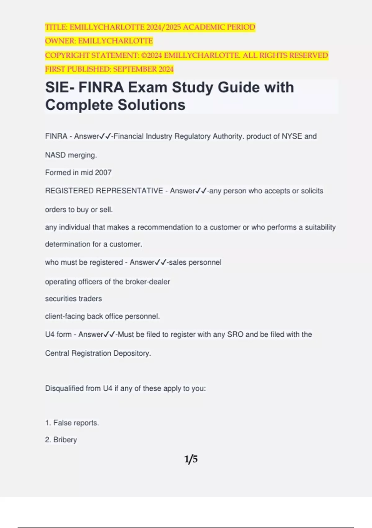 SIE- FINRA Exam Study Guide with Complete Solutions FINRA - Answer️️ -Financial Industry Regulatory Authority. product of NYSE and NASD merging. Formed in mid 2007 REGISTERED REPRESENTATIVE - Answer️️ -any person who accepts or solicits orders to buy or sell. any individual that makes a recommendation to a customer or who performs a suitability determination for a customer. who must be registered - Answer️️ -sales personnel operating officers of the broker-dealer securities traders client-facing back office personnel. U4 form - Answer️️ -Must be filed to register with any SRO and be filed with the Central Registration Depository. Disqualified from U4 if any of these apply to you: 1. False reports. 2. Bribery TITLE: EMILLYCHARLOTTE 2024/2025 ACADEMIC PERIOD OWNER: EMILLYCHARLOTTE COPYRIGHT STATEMENT: ©2024 EMILLYCHARLOTTE. ALL RIGHTS RESERVED FIRST PUBLISHED: SEPTEMBER 2024 2/5 3. Perjury 4. ANY other felony. Banned for 10 years and needs waiver to be hired All this info is entered into the Central Registration Depository (CRD) database run by FINRA. continuing education requirements - Answer️️ -training session reviewing regulations be completed on 2nd anniversary of registration and every 3 year thereafter. If incomplete, license is inactive without pay. Annual training needed. Annual compliance review must be attended by all registered persons. broker check website - Answer️️ -P rovides info on broker's employment history brokers licenses broker's complaint and disciplinary record Broker's outside business activities options transaction costs - Answer️️ -are signific