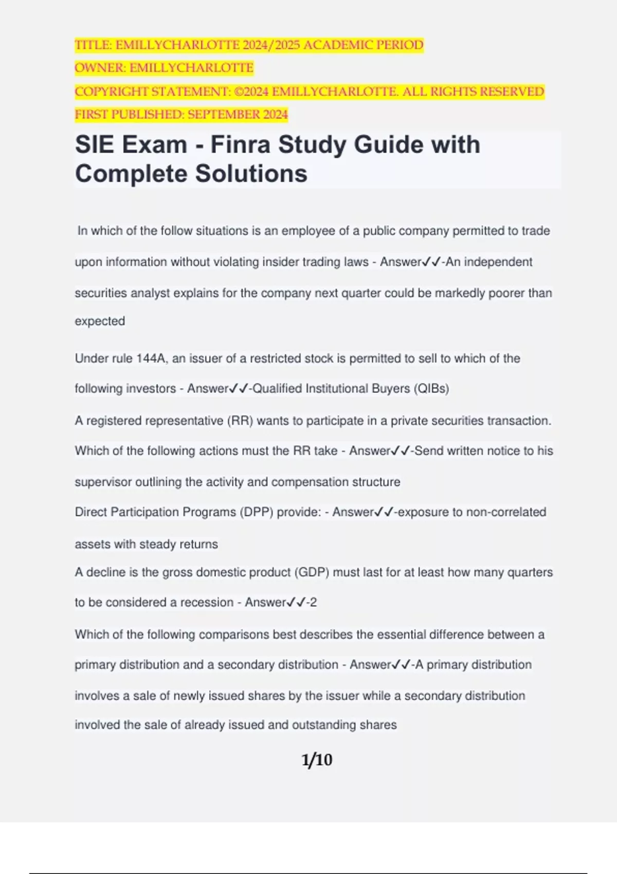 SIE Exam - Finra Study Guide with Complete Solutions In which of the follow situations is an employee of a public company permitted to trade upon information without violating insider trading laws - Answer️️ -An independent securities analyst explains for the company next quarter could be markedly poorer than expected Under rule 144A, an issuer of a restricted stock is permitted to sell to which of the following investors - Answer️️ -Qualified Institutional Buyers (QIBs) A registered representative (RR) wants to participate in a private securities transaction. Which of the following actions must the RR take - Answer️️ -Send written notice to his supervisor outlining the activity and compensation structure Direct Participation Programs (DPP) provide: - Answer️️ -exposure to non-correlated assets with steady returns A decline is the gross domestic product (GDP) must last for at least how many quarters to be considered a recession - Answer️️ -2 Which of the following comparisons best describes the essential difference between a primary distribution and a secondary distribution - Answer️️ -A primary distribution involves a sale of newly issued shares by the issuer while a secondary distribution involved the sale of already issued and outstanding shares TITLE: EMILLYCHARLOTTE 2024/2025 ACADEMIC PERIOD OWNER: EMILLYCHARLOTTE COPYRIGHT STATEMENT: ©2024 EMILLYCHARLOTTE. ALL RIGHTS RESERVED FIRST PUBLISHED: SEPTEMBER 2024 2/10 A customer has a cash balance in her account together with long positions in several securities. She has made no securities transactions in the account during the past 18 months. How often must the firm send her an account statement - Answer️️ -Quarterly Which of the following communications with the public is considered misleading - Answer️️ -Literature providing 10-year performance information to support predictions of future performance Which of the following form U4 reportable events results in a statutory disqualification - Answer️️ -A felony conviction for a driving under the influence (DUI) charge Which of the following investment risks is the greatest risk in a variable life insurance policy - Answer️️ -Market risk Which of the following stakeholders has first claim priority in a Chapter 11 proceeding - Answer️️ -Secured debt holder Under FINRA rules, noncash compensation connected with the sale of variable contracts includes all of the following items except: - Answer️️ -commisions The redemption value of an open-end investment company shares is based on the - Answer️️ -NAV computed after the order is received The owner of which the following products is the most exposed to inflationary risk - Answer️️ -Treasury bonds TITLE: EMILLYCHARLOTTE 2024/2025 ACADEMIC PERIOD OWNER: EMILLYCHARLOTTE COPYRIGHT STATEMENT: ©2024 EMILLYCHARLOTTE. ALL RIGHTS RESERVED FIRST PUBLISHED: SEPTEMBER 2024 3/10 Which of the following statements is true regarding a customer account held as tenants in common - Answer️️ -The ownership for the decedent's assets is governed by their will or state law A customer buys 1 ABC Jan 35 put for a premium of $3 and simultaneously buys 100 shares of ABC stock for $35 per share. The customer will break even when the stock is selling at what price per share at expiration - Answer️️ -$38 When is interest on treasury notes paid - Answer️️ -Semiannually Blue-Sky laws are regulated by which of the following entities - Answer️️ -State securities regulators A broker-dealer is permitted to accept payment for a new issue from a new customer when the - Answer️️ -Registration is effective Under Federal Reserve Regulation T, a 90-day restriction is imposed when a customer opens and closes which of the following positions - Answer️️ -The same stock in a cash account without paying for the stock in full In the over-the-counter market, the term "spread" refers to the differ