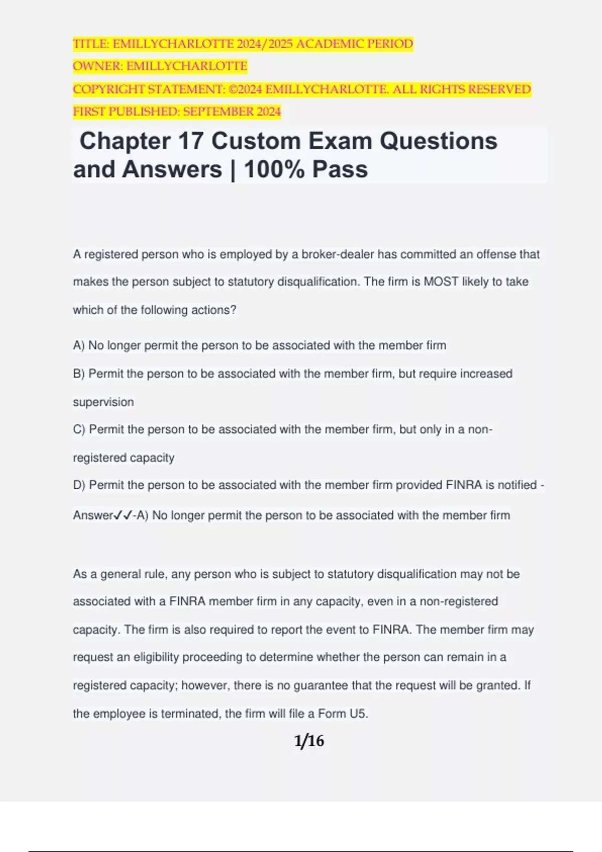 Chapter 17 Custom Exam Questions and Answers | 100% Pass A registered person who is employed by a broker-dealer has committed an offense that makes the person subject to statutory disqualification. The firm is MOST likely to take which of the following actions? A) No longer permit the person to be associated with the member firm B) Permit the person to be associated with the member firm, but require increased supervision C) Permit the person to be associated with the member firm, but only in a non- registered capacity D) Permit the person to be associated with the member firm provided FINRA is notified - Answer️️ -A) No longer permit the person to be associated with the member firm As a general rule, any person who is subject to statutory disqualification may not be associated with a FINRA member firm in any capacity, even in a non-registered capacity. The firm is also required to report the event to FINRA. The member firm may request an eligibility proceeding to determine whether the person can remain in a registered capacity; however, there is no guarantee that the request will be granted. If the employee is terminated, the firm will file a Form U5. TITLE: EMILLYCHARLOTTE 2024/2025 ACADEMIC PERIOD OWNER: EMILLYCHARLOTTE COPYRIGHT STATEMENT: ©2024 EMILLYCHARLOTTE. ALL RIGHTS RESERVED FIRST PUBLISHED: SEPTEMBER 2024 2/16 A person is subject to the Regulatory Element of Continuing Education: A) If she has failed any qualification exam B) On the second anniversary of her registration and every three years thereafter C) Annually D) Only if she has been subject to disciplinary action - Answer️️ -B) On the second anniversary of her registration and every three years thereafter The Continuing Education Regulatory Element for registered personnel begins on the second anniversary of her initial registration, and then is triggered every three years thereafter. If representatives do not participate, their registration becomes inactive. There is no graduation from the Regulatory Element. Which of the following descriptions BEST defines the Regulatory Element of Continuing Education (CE)? A) The requirement is triggered when a registered person violates industry rules. B) It can be accomplished by attending a seminar given by your firm. C) It ensures that registered persons are kept up-to-date on sales practices, compliance, and regulatory matters. D) It is a prerequisite for principal registration. - Answer️️ -C) It ensures that registered persons are kept up-to-date on sales practices, compliance, and regulatory matters. TITLE: EMILLYCHARLOTTE 2024/2025 ACADEMIC PERIOD OWNER: EMILLYCHARLOTTE COPYRIGHT STATEMENT: ©2024 EMILLYCHARLOTTE. ALL RIGHTS RESERVED FIRST PUBLISHED: SEPTEMBER 2024 3/16 The Regulatory Element of CE is a compulsory requirement that must be met on the second anniversary date of a registered representative's registration. It continues at a three-year interval thereafter. Which of the following employees of a broker-dealer is not required to be fingerprinted? A) A back office employee who handles customer funds. B) A clerk who has access to records of original entry. C) A senior officer of the firm who only provides capital to the firm. D) A registered representative who processes trades in the back office. - Answer️️ -C) A senior officer of the firm who only provides capital to the firm. According to SEC Rule 17-2, all partners, directors, officers and employees of broker- dealers who are involved in the sale of securities, handling securities, monies, or records of original entry, or supervise any of the above must be fingerprinted. An officer of a firm who simply provides capital to the firm and is not involved in the handling of funds and/or securities, or dealing with the firm's books and records, is exempt from the fingerprinting requirement. (17583) If a newly hired person is employed by a broker-dealer and will be offering corporate securities, she can become FINRA registered by: A) Passing the SIE Exam only B) Passing the SIE Exam the Series 6 Exam C) Passing the Series 6 Exam only TITLE: EMILLYCHARLOTTE 2024/2025 ACADEMIC PERIOD OWNER: EMILLYCHARLOTTE COPYRIGHT STATEMENT: ©2024 EMILLYCHARLOTTE. ALL RIGHTS RESERVED FIRST PUBLISHED: SEPTEMBER 2024 4/16 D) Passing the SIE Exam and the Series 7 Exam - Answer️️ -D) Passing the SIE Exam and the Series 7 Exam In order to become properly registered or qualified, a newly hired person must pass the SIE Exam and the appropriate FINRA licensing exam. To offer corporate securities, a person must pass the Series 7 Exam plus the SIE Exam. A registered representative who just passed the Series 7 Examination disclosed several of the test questions to a colleague who is about to take the same examination. The colleague uses this information, but still fails the test. Which of the following statements is TRUE? A) FINRA may discipline the person who disclosed the information, but the person who received the information isn't subject to disciplinary action because he didn't pass the examination. B) FINRA may discipline the person who received the information, but the person who disclosed the information isn't subject to disciplinary action. C) FINRA may discipline both individuals. D) Neither person is subject to disciplinary action since this activity is permitted as long as the test items are not written down. - Answer️️ -C) FINRA may discipline both individuals. TITLE: EMILLYCHARLOTTE 2024/2025 ACADEMIC PERIOD OWNER: EMILLYCHARLOTTE COPYRIGHT STATEMENT: ©2024 EMILLYCHARLOTTE. ALL RIGHTS RESERVED FIRST PUBLISHED: SEPTEMBER 2024 5/16 Both persons are subject to disciplinary action. FINRA considers the content of its qualification examinations confidential; therefore, it's a violation to give assistance to, or receive assistance from, any person taking an examination. Additionally, it's a violation to disclose parts of an examination to another person, to receive parts of an examination from another person, to com