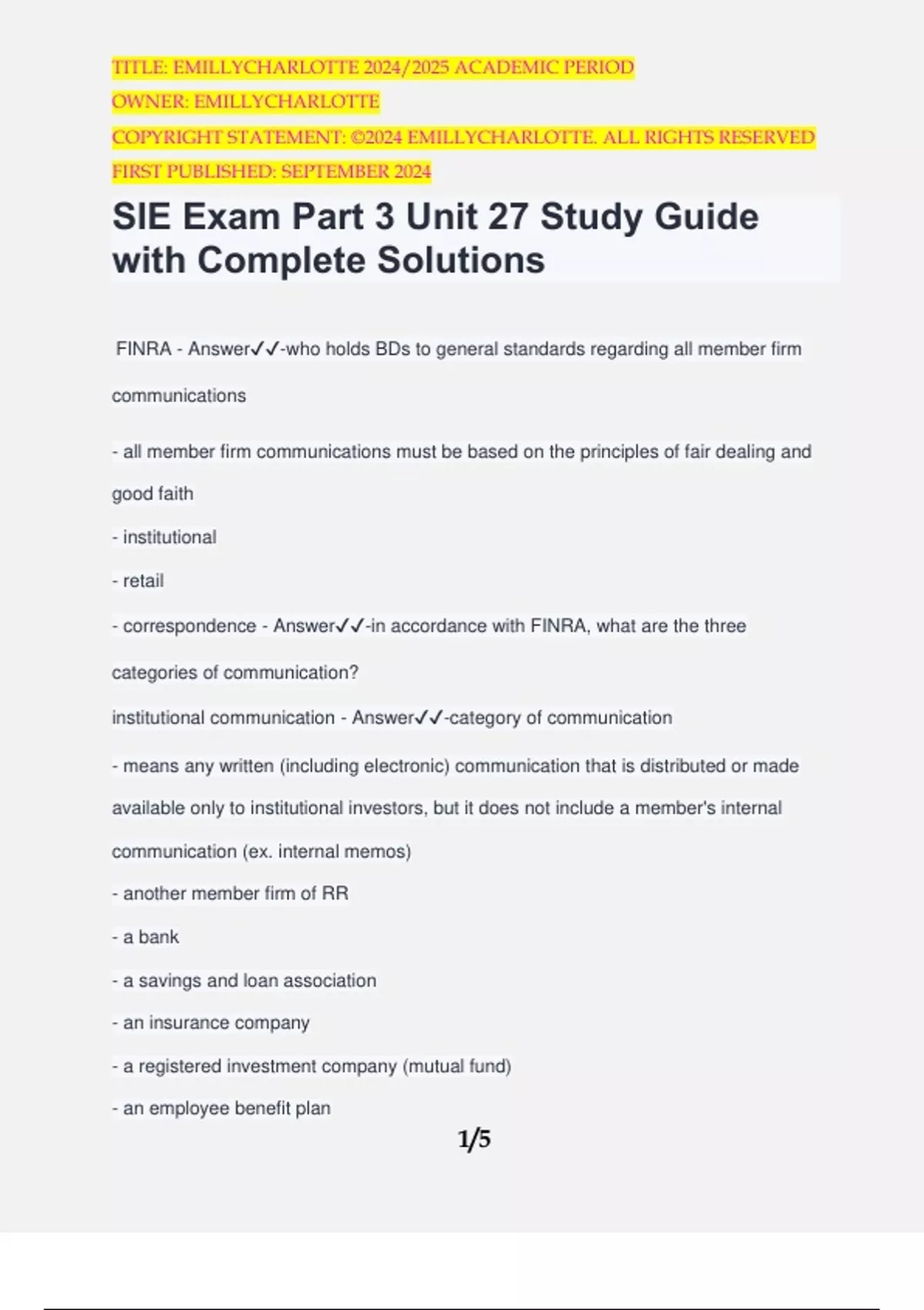 SIE Exam Part 3 Unit 27 Study Guide with Complete Solutions FINRA - Answer️️ -who holds BDs to general standards regarding all member firm communications - all member firm communications must be based on the principles of fair dealing and good faith - institutional - retail - correspondence - Answer️️ -in accordance with FINRA, what are the three categories of communication? institutional communication - Answer️️ -category of communication - means any written (including electronic) communication that is distributed or made available only to institutional investors, but it does not include a member's internal communication (ex. internal memos) - another member firm of RR - a bank - a savings and loan association - an insurance company - a registered investment company (mutual fund) - an employee benefit plan TITLE: EMILLYCHARLOTTE 2024/2025 ACADEMIC PERIOD OWNER: EMILLYCHARLOTTE COPYRIGHT STATEMENT: ©2024 EMILLYCHARLOTTE. ALL RIGHTS RESERVED FIRST PUBLISHED: SEPTEMBER 2024 2/5 - a governmental entity or subdivision - a person acting solely on behalf of an institutional investor - any entity with $50 million or more of total assets, including natural persons - Answer️️ -what are some examples of institutional investors retail communication - Answer️️ -category for communication - means any written (including electronic) communication that is distributed or made available to more the 25 retail investors within any 30-calendar-day period - a copy must be filed with FINRA retail investor - Answer️️ -any person other than an institutional investor, regardless of whether the person has an account with the member correspondence - Answer️️ -category for communication - means any written (including electronic) comm