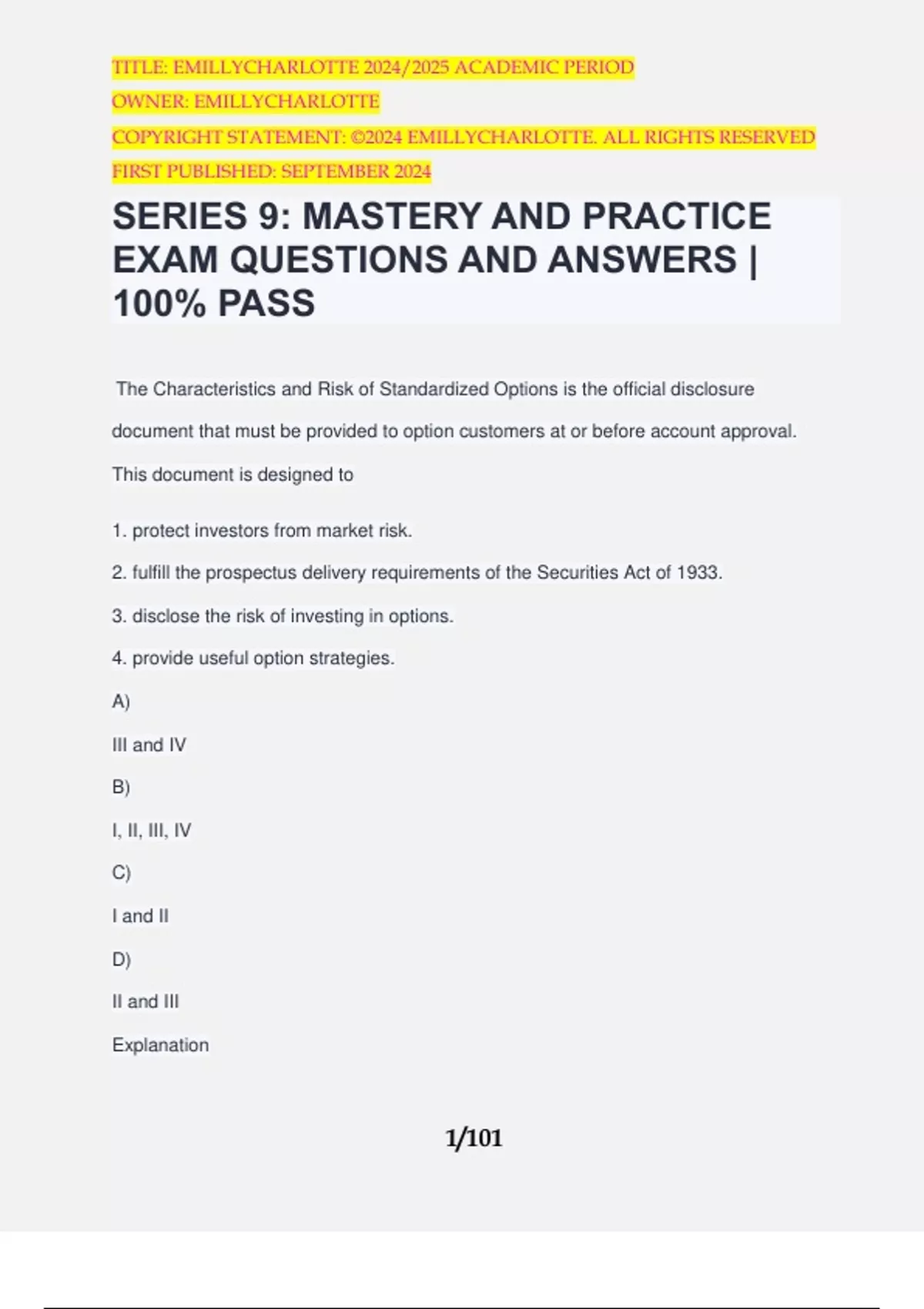 SERIES 9: MASTERY AND PRACTICE EXAM QUESTIONS AND ANSWERS | 100% PASS The Characteristics and Risk of Standardized Options is the official disclosure document that must be provided to option customers at or before account approval. This document is designed to 1. protect investors from market risk. 2. fulfill the prospectus delivery requirements of the Securities Act of 1933. 3. disclose the risk of investing in options. 4. provide useful option strategies. A) III and IV B) I, II, III, IV C) I and II D) II and III Explanation TITLE: EMILLYCHARLOTTE 2024/2025 ACADEMIC PERIOD OWNER: EMILLYCHARLOTTE COPYRIGHT STATEMENT: ©2024 EMILLYCHARLOTTE. ALL RIGHTS RESERVED FIRST PUBLISHED: SEPTEMBER 2024 2/101 The options clearing corporate disclosure document, The Characteristics and Risk of Standardized Options, creates an exemption from the prospectus delivery requirements of the Securities Act of 1933. Its primary purpose is to disclose the risk of option investing. It does not protect against market risk, nor does it provide strategies. - Answer️️ -D 2 & 3 Within how many days must an options-related complaint be submitted to FINRA? A) Customer complaints must be reported to FINRA within 15 days at the end of the calendar quarter in which the complaint was discovered. B) Customer complaints must be reported to FINRA within 10 calendar days. C) Customer complaints must be reported to FINRA within 30 business days. D) Customer complaints must be reported to FINRA within 15 business days. Explanation FINRA rules require members to file information on customer complaints, electronically, within 15 days of the end of each calendar quarter. LO 4.c - Answer️️ -A Regulation SHO has a circuit breaker test that when triggered prohibits short sale orders TITLE: EMILLYCHARLOTTE 2024/2025 ACADEMIC PERIOD OWNER: EMILLYCHARLOTTE COPYRIGHT STATEMENT: ©2024 EMILLYCHARLOTTE. ALL RIGHTS RESERVED FIRST PUBLISHED: SEPTEMBER 2024 3/101 A) for the security until a bona fide locate has been established. B) for the remainder of the trading day and the day following. C) until close-out requirements have been made. D) for a period until the price of the security rises above the triggered limit. Explanation Exchanges, ATSs, and trading centers have policies to restrict short selling on a covered security that has a 10% decline in any one day. The purpose of the rule is to prevent a piling-on effect in the marketplace. Short exempt orders may still trade. - Answer️️ -B If an assignment notice is received on Tuesday, July 12, for a short call on a covered write position, the stock settlement (delivery) would occur on A) Thursday, July 14. B) Wednesday, July 13. C) Friday, July 15. TITLE: EMILLYCHARLOTTE 2024/2025 ACADEMIC PERIOD OWNER: EMILLYCHARLOTTE COPYRIGHT STATEMENT: ©2024 EMILLYCHARLOTTE. ALL RIGHTS RESERVED FIRST PUBLISHED: SEPTEMBER 2024 4/101 D) Monday, July 11. Explanation The settlement will take place on Thursday, July 14, T + 2. The assignment date becomes the trade date for the stock, and regular-way settlement is T + 2 (trade date plus two days). LO 7.d - Answer️️ -A A client of the firm is in violation of the position limit rule of 25,000 option contracts if A) the client's account has 20,000 short calls and 10, 000 short puts. B) the client's account has 20,000 long calls and 10, 000 long puts. C) the client's account has 20,000 long calls and 10,000 short puts. D) the client's account has 20,000 short calls and 10, 000 long calls. Explanation The OCC limits the number of options that an individual investor can control on the same side of the market, long calls, and short puts, or short calls and long puts. 20,000 long calls and 10,000 short puts are both on the same side of the market (bullish) for an aggregate position of 30,000 contracts, which is a violation. TITLE: EMILLYCHARLOTTE 2024/2025 ACADEMIC PERIOD OWNER: EMILLYCHARLOTTE COPYRIGHT STATEMENT: ©2024 EMILLYCHARLOTTE. ALL RIGHTS RESERVED FIRST PUBLISHED: SEPTEMBER 2024 5/101 LO 6.b - Answer️️ -C Market and marketable orders sent to the exchange nonelectronically are required to contain all the following information except A) the number of contracts and strike price. B) the customer name and account number. C) the expiration month and year. D) buy or sell, put, or call. Explanation The order at least must have at least the following specific information with respect to the order: (i) the option symbol, (ii) the expiration month, (iii) the expiration year, (iv) the strike price, (v) buy or sell, (vi) call or put, (vii) the number of contracts, and (viii) the Clearing Trading Permit Holder. The customer name and account number are not required for trading floor or exchange execution. LO 6.h - Answer️️ -B The phrase public appearance as defined by FINRA, means participation in any of the following except A) TITLE: EMILLYCHARLOTTE 2024/2025 ACADEMIC PERIOD OWNER: EMILLYCHARLOTTE COPYRIGHT STATEMENT: ©2024 EMILLYCHARLOTTE. ALL RIGHTS RESERVED FIRST PUBLISHED: SEPTEMBER 2024 6/101 a written statement distributed to 15 institutional clients. B) a radio, television, or print media interview. C) the writing of a print media article, in which a research analyst makes a recommendation or offers an opinion concerning an equity security. D) participation in a conference call, seminar, forum (including an interactive electronic forum) or other public speaking activity before 15 or more persons. Explanation A written statement distributed to 15 institutional clients would be a communication and would not be considered a public appearance. LO 8.f - Answer️️ -A A branch manager receives an incomplete options application from a broker. The branch manager should A) document the incident, return the application to the broker requesting all the required information and possibly recommend training by the ROP. B) contact the customer to make sure all the information is accurate and complete. C) TITLE: EMILLYCHARLOTTE 2024/2025 ACADEMIC PERIO