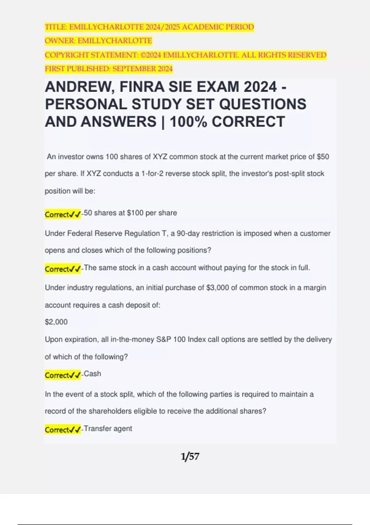 ANDREW, FINRA SIE EXAM 2024 - PERSONAL STUDY SET QUESTIONS AND ANSWERS | 100% CORRECT An investor owns 100 shares of XYZ common stock at the current market price of $50 per share. If XYZ conducts a 1-for-2 reverse stock split, the investor's post-split stock position will be: Correct️️ -50 shares at $100 per share Under Federal Reserve Regulation T, a 90-day restriction is imposed when a customer opens and closes which of the following positions? Correct️️ -The same stock in a cash account without paying for the stock in full. Under industry regulations, an initial purchase of $3,000 of common stock in a margin account requires a cash deposit of: $2,000 Upon expiration, all in-the-money S&P 100 Index call options are settled by the delivery of which of the following? Correct️️ -Cash In the event of a stock split, which of the following parties is required to maintain a record of the shareholders eligible to receive the additional shares? Correct️️ -Transfer agent TITLE: EMILLYCHARLOTTE 2024/2025 ACADEMIC PERIOD OWNER: EMILLYCHARLOTTE COPYRIGHT STATEMENT: ©2024 EMILLYCHARLOTTE. ALL RIGHTS RESERVED FIRST PUBLISHED: SEPTEMBER 2024 2/57 Which of the following statements is true regarding a customer account held as tenants in common? Correct️️ -The ownership of the decedent's assets is governed by their will or state law. An associated person who is not a registered representative is permitted to engage in which of the following activities? Correct️️ -Provide account opening forms to a new customer. Under Rule 144A, an issuer of restricted stock is permitted to sell to which of the following investors? Correct️️ -Qualified institutional buyers (QIBs) The last transaction in XYZ 5.50s 2030 was at 102. This bond is selling at: a premium Which of the following represents the effect of a stock split? Correct️️ -The price per share of common stock decreases The price per share of common stock decreases. To offer its shareholders a privilege to obtain its shares at a fixed price, which of the following products does a corporation issue? Correct️️ -Rights In a period of low inflation and economic recession, the Federal Reserve is expected to take which of the following actions? Correct️️ -Buy bonds in the open market. TITLE: EMILLYCHARLOTTE 2024/2025 ACADEMIC PERIOD OWNER: EMILLYCHARLOTTE COPYRIGHT STATEMENT: ©2024 EMILLYCHARLOTTE. ALL RIGHTS RESERVED FIRST PUBLISHED: SEPTEMBER 2024 3/57 Which of the following communications with the public is considered misleading? Correct️️ -Literature providing 10-year performance information to support predictions of future performance. Which of the following statements is true regarding the concept of an annuity contract? Correct️️ -The kind of annuity selected partly determines the payment amounts to the annuitant. Which of the following outcomes are possible for the
