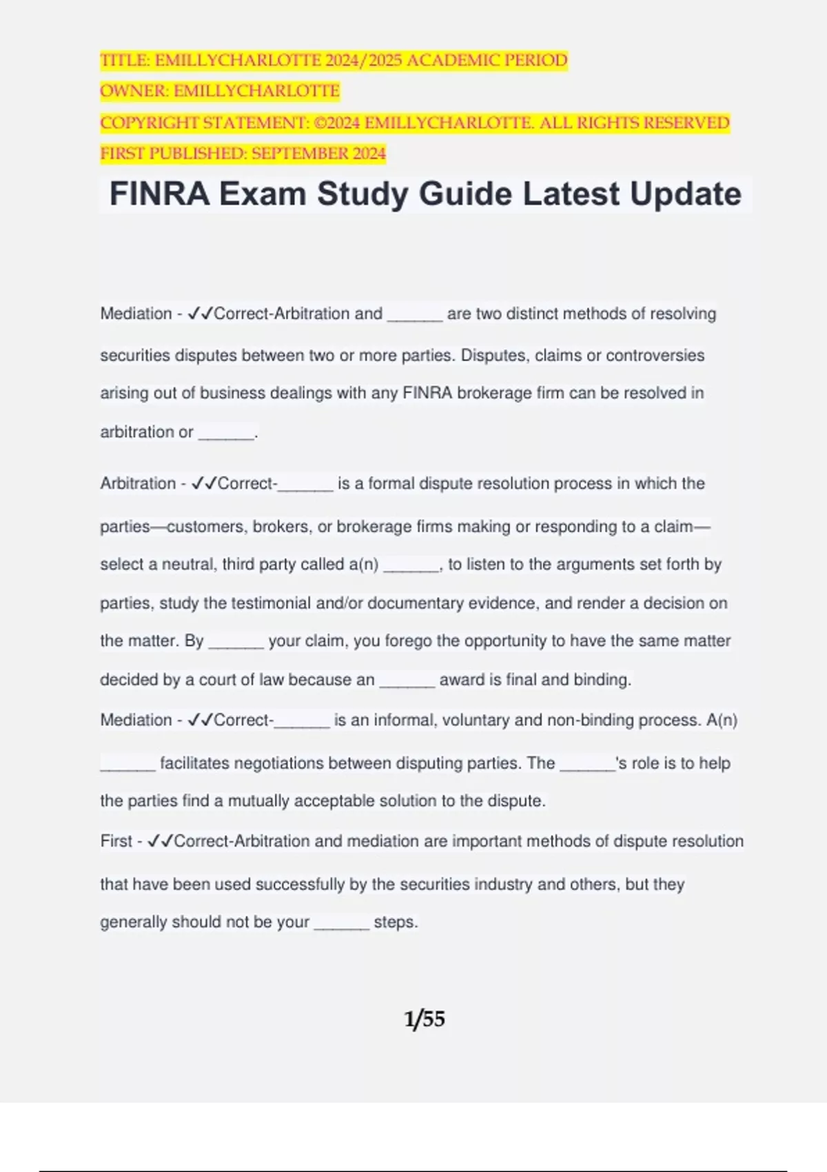 FINRA Exam Study Guide Latest Update Mediation - ️️ Correct-Arbitration and ______ are two distinct methods of resolving securities disputes between two or more parties. Disputes, claims or controversies arising out of business dealings with any FINRA brokerage firm can be resolved in arbitration or ______. Arbitration - ️️ Correct-______ is a formal dispute resolution process in which the parties—customers, brokers, or brokerage firms making or responding to a claim— select a neutral, third party called a(n) ______, to listen to the arguments set forth by parties, study the testimonial and/or documentary evidence, and render a decision on the matter. By ______ your claim, you forego the opportunity to have the same matter decided by a court of law because an ______ award is final and binding. Mediation - ️️ Correct-______ is an informal, voluntary and non-binding process. A(n) ______ facilitates negotiations between disputing parties. The ______'s role is to help the parties find a mutually acceptable solution to the dispute. First - ️️ Correct-Arbitration and mediation are important methods of dispute resolution that have been used successfully by the securities industry and others, but they generally should not be your ______ steps. TITLE: EMILLYCHARLOTTE 2024/2025 ACADEMIC PERIOD OWNER: EMILLYCHARLOTTE COPYRIGHT STATEMENT: ©2024 EMILLYCHARLOTTE. ALL RIGHTS RESERVED FIRST PUBLISHED: SEPTEMBER 2024 2/55 Arbitration - ️️ Correct-______ is a method of resolving a dispute between two or more parties by neutral, qualified individuals, who serve as decision-makers after weighing the facts of each case presented. The decision-makers are called ______. ______ of securities disputes against brokerage firms, brokers, or both provides a prompt and inexpensive means of resolving issues. There are certain laws governing the conduct of an ______ proceeding. The most important of these is perhaps the fact that an ______ award is final and binding, subject to review by a court only on a very limited basis. Parties should also recognize that ______ their claims precludes them from pursuing the same claims through the courts. Request for Mediation - ️️ Correct-You may file a ______ ______ ______ at any time, whether or not you have already filed an arbitration claim. However, ______ is a voluntary process — no party is required to ______ a dispute. When we receive your request, FINRA Dispute Resolution staff will contact the other party or parties to the dispute to explain the ______ process, and seek their agreement to ______. Mediation - ️️ Correct-Initiate a ______: This is the first step of the ______ process. When one party expresses an interest in ______, FINRA will contact the other parties to determine their interest, The parties may submit all or some of the issues in dispute to ______, and may ______ selected substantive or procedural issues. Complaint - ️️ Correct-If you file a ______ with the Investor ______ Center, FINRA can investigate any potentially fraudulent or suspicious activities by brokerage firms or TITLE: EMILLYCHARLOTTE 2024/2025 ACADEMIC PERIOD OWNER: EMILLYCHARLOTTE COPYRIGHT STATEMENT: ©2024 EMILLYCHARLOTTE. ALL RIGHTS RESERVED FIRST PUBLISHED: SEPTEMBER 2024 3/55 registered representatives. You must initiate an arbitration or mediation to pursue monetary damages or other restitution. Attorney - ️️ Correct-You should consider hiring an ______ to represent you during the arbitration or mediation proceedings to provide direction and advice. Even if you do not choose to hire an ______, brokerage firms are generally represented by an ______. If you cannot afford an ______, some law schools provide legal representation through securities arbitration clinics. You can also check: (1) American Bar Association; (2) Public Investors Arbitration Bar Association; (3) Martindale - Hubbell Database - ️️ Correct-FINRA's Arbitration Awards ______ enables users to search online for FINRA and NASD arbitration awards free of charge, seven days a week. Exchanges - ️️ Correct-FINRA provides dispute resolution services for several ______ that are not able to staff or operate a dispute resolution program. These services include administration of the ______'s member-member, member-investor and member- employer securities-industry related disputes. The term "member" may include brokerage firms that are not members of FINRA. Code of Mediation Procedure - ️️ Correct-This Code contains the official FINRA rules governing mediations. (7 pages) Statement of Claim - ️️ Correct-The arbitration process begins with a party filing a ______ ______ _____ with FINRA. The party who files the ______ ______ ______ is called a claimant. The party against whom the ______ ______ ______ is filed is called the respondent. The ______ ______ _____ should provide the details of the dispute, TITLE: EMILLYCHARLOTTE 2024/2025 ACADEMIC PERIOD OWNER: EMILLYCHARLOTTE COPYRIGHT STATEMENT: ©2024 EMILLYCHARLOTTE. ALL RIGHTS RESERVED FIRST PUBLISHED: SEPTEMBER 2024 4/55 including relevant dates, names of entities and individuals involved, and the type of relief requested and the respondents from whom the claimant is seeking relief or damages. The type of relief a claimant may request, includes, but is not limited to, actual monetary damages, interest, and specific performance. Answer - ️️ Correct-An ______ is a written document that specifies the relevant facts and available defenses to the Statement of Claim. A respondent files an answer to the claimant's Statement of Claim. Number - ️️ Correct-The ______ of arbitrators appointed to a case depends on the amount and type of relief requested in the Statement of Claim. Initial Prehearing Conference (IPHC) - ️️ Correct-Once the panel is appointed, FINRA schedules the ______ ______ ______ (______). The ______ is the first time that the parties and arbitrators meet to set the schedule for the case and usually held by