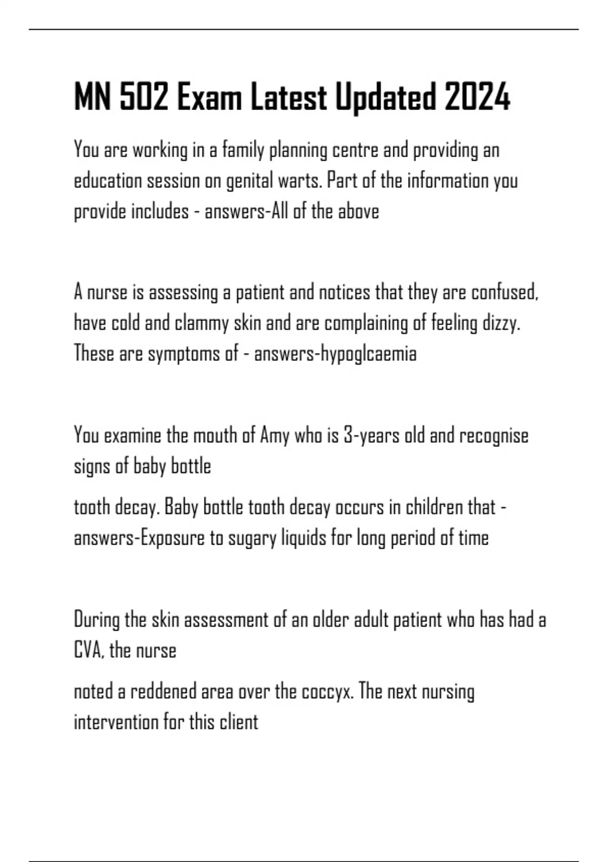 MN 502 Exam Latest Updated 2024 You are working in a family planning centre and providing an education session on genital warts. Part of the information you provide includes - answers-All of the above A nurse is assessing a patient and notices that they are confused, have cold and clammy skin and are complaining of feeling dizzy. These are symptoms of - answers-hypoglcaemia You examine the mouth of Amy who is 3-years old and recognise signs of baby bottle tooth decay. Baby bottle tooth decay occurs in children that - answers-Exposure to sugary liquids for long period of time During the skin assessment of an older adult patient who has had a CVA, the nurse noted a reddened area over the coccyx. The next nursing intervention for this client should include - answers-reposition the patient off the ccocyx and reassess in one hour The proliferation phase of wound healing is characterised by - answers-The development of new tissue A 19-year old male client presents describing urethral discharge and pain on urination. What other information do you require before proceeding to physical examination? - answers-history of recent sexual activity The main reason for a nurse to administer an enema is to - answers-stimulating peristalsis, breaking up faecal mass and stretching the rectal wall Three complications of diabetes are - answers-renal failure, loss of vision, peripheral vascular disease Which of these people is MOST likely at risk of developing an iron deficiency? - answers-A 17yr old girl What is the term given to unexpected effects of medication? - answers-Adverse effects Which of the following drugs are required to be stored in a locked secure cabinet and are counted on a regular basis? - answers-Narcotics Your patient is an 86yr old male who is incontinent at night. which of the following would be an alternative to catheterisation fro this patient - answers-Applying a uridome at night
