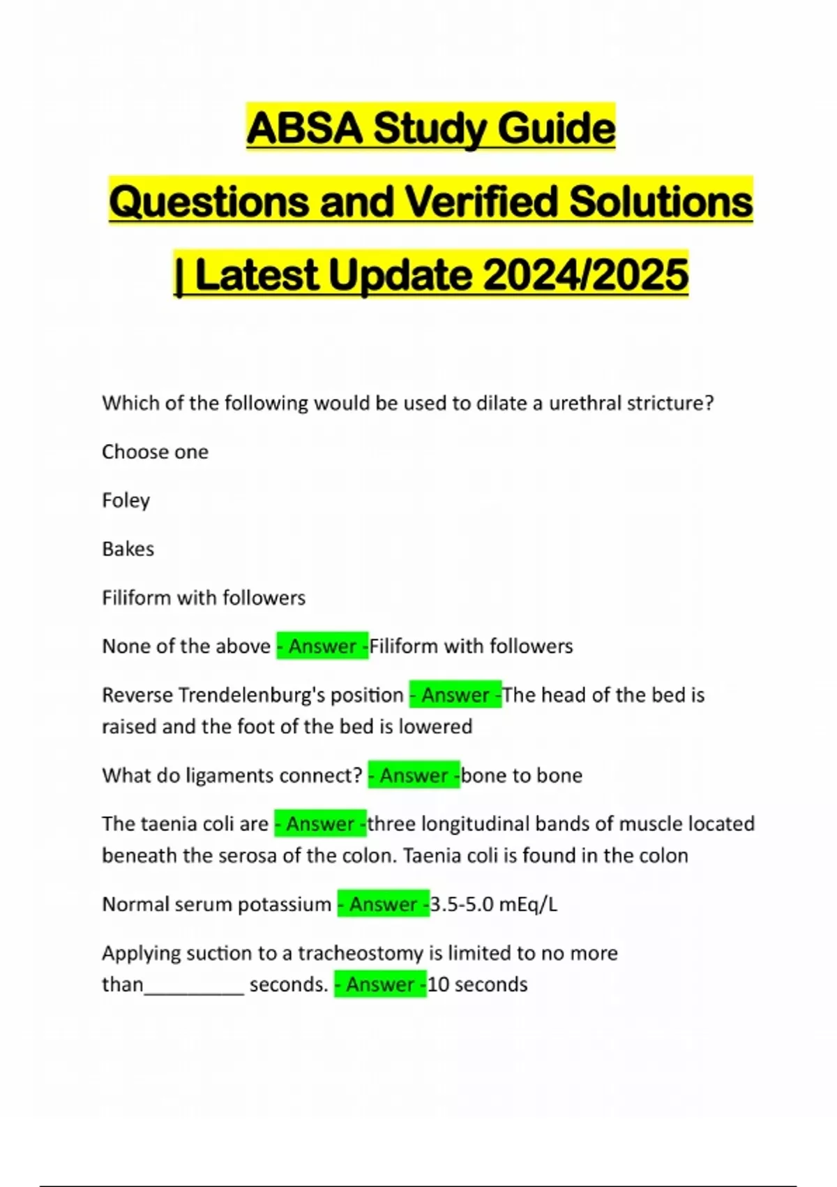 ABSA Study Guide Questions and Verified Solutions | Latest Update 2024/2025 Which of the following would be used to dilate a urethral stricture? Choose one Foley Bakes Filiform with followers None of the above - Answer -Filiform with followers Reverse Trendelenburg's position - Answer -The head of the bed is raised and the foot of the bed is lowered What do ligaments connect? - Answer -bone to bone The taenia coli are - Answer -three longitudinal bands of muscle located beneath the serosa of the colon. Taenia coli is found in the colon Normal serum potassium - Answer -3.5-5.0 mEq/L Applying suction to a tracheostomy is limited to no more than_________ seconds. - Answer -10 secondschest compressions - Answer -Rapid, deep, regular compressions on the center of the chest in an attempt to circulate blood to the brain, lungs, and heart. At least 2 inches in depth for an adult The spleen is :