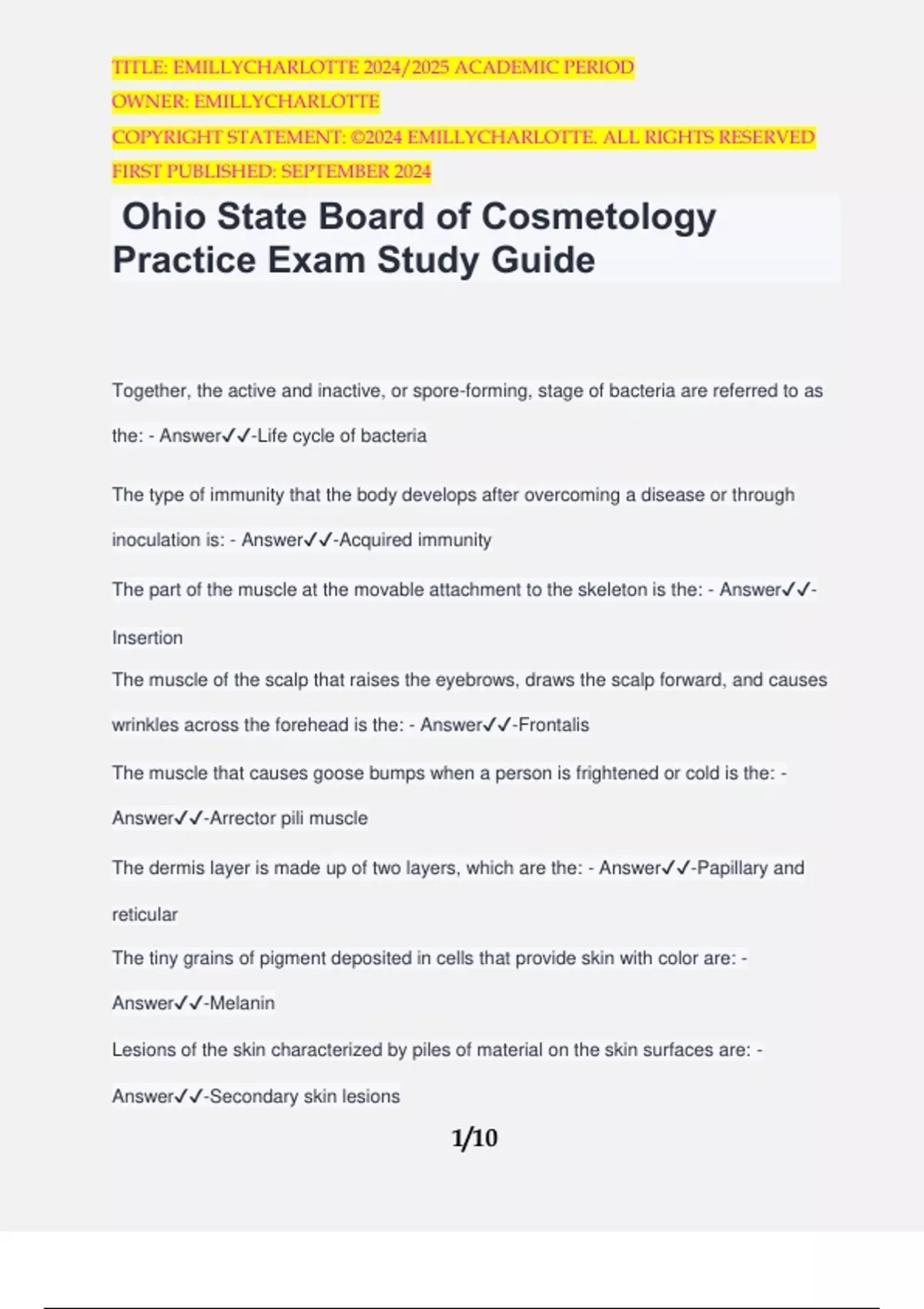 Ohio State Board of Cosmetology Practice Exam Study Guide Together, the active and inactive, or spore-forming, stage of bacteria are referred to as the: - Answer️️ -Life cycle of bacteria The type of immunity that the body develops after overcoming a disease or through inoculation is: - Answer️️ -Acquired immunity The part of the muscle at the movable attachment to the skeleton is the: - Answer️️ - Insertion The muscle of the scalp that raises the eyebrows, draws the scalp forward, and causes wrinkles across the forehead is the: - Answer️️ -Frontalis The muscle that causes goose bumps when a person is frightened or cold is the: - Answer️️ -Arrector pili muscle The dermis layer is made up of two layers, which are the: - Answer️️ -Papillary and reticular The tiny grains of pigment deposited in cells that provide skin with color are: - Answer️️ -Melanin Lesions of the skin characterized by piles of material on the skin surfaces are: - Answer️️ -Secondary skin lesions TITLE: EMILLYCHARLOTTE 2024/2025 ACADEMIC PERIOD OWNER: EMILLYCHARLOTTE COPYRIGHT STATEMENT: ©2024 EMILLYCHARLOTTE. ALL RIGHTS RESERVED FIRST PUBLISHED: SEPTEMBER 2024 2/10 An open lesion of the skin or mucous membrane, accompanied by pus and characterized by loss of skin depth, is an: - Answer️️ -Ulcer A hair follicle filled with keratin and sebum forms a: - Answer️️ -Comedo The American Cancer Society recommends using a checklist to recognize potential skin cancer or changes in moles, using the letter B to check mole: - Answer️️ -Borders The natural nail is part of what system? - Answer️️ -Integumentary The water content of the natural nail directly affect the nails: - Answer️️ -Flexibility Nails with a noticeably thin, white nail plate that are more flexible than normal nails are: - Answer️️ -Eggshell nails A dark band within the nail plate extending from the base to the free edge due to increased pigmentation is: - Answer️️ -Melanonychia