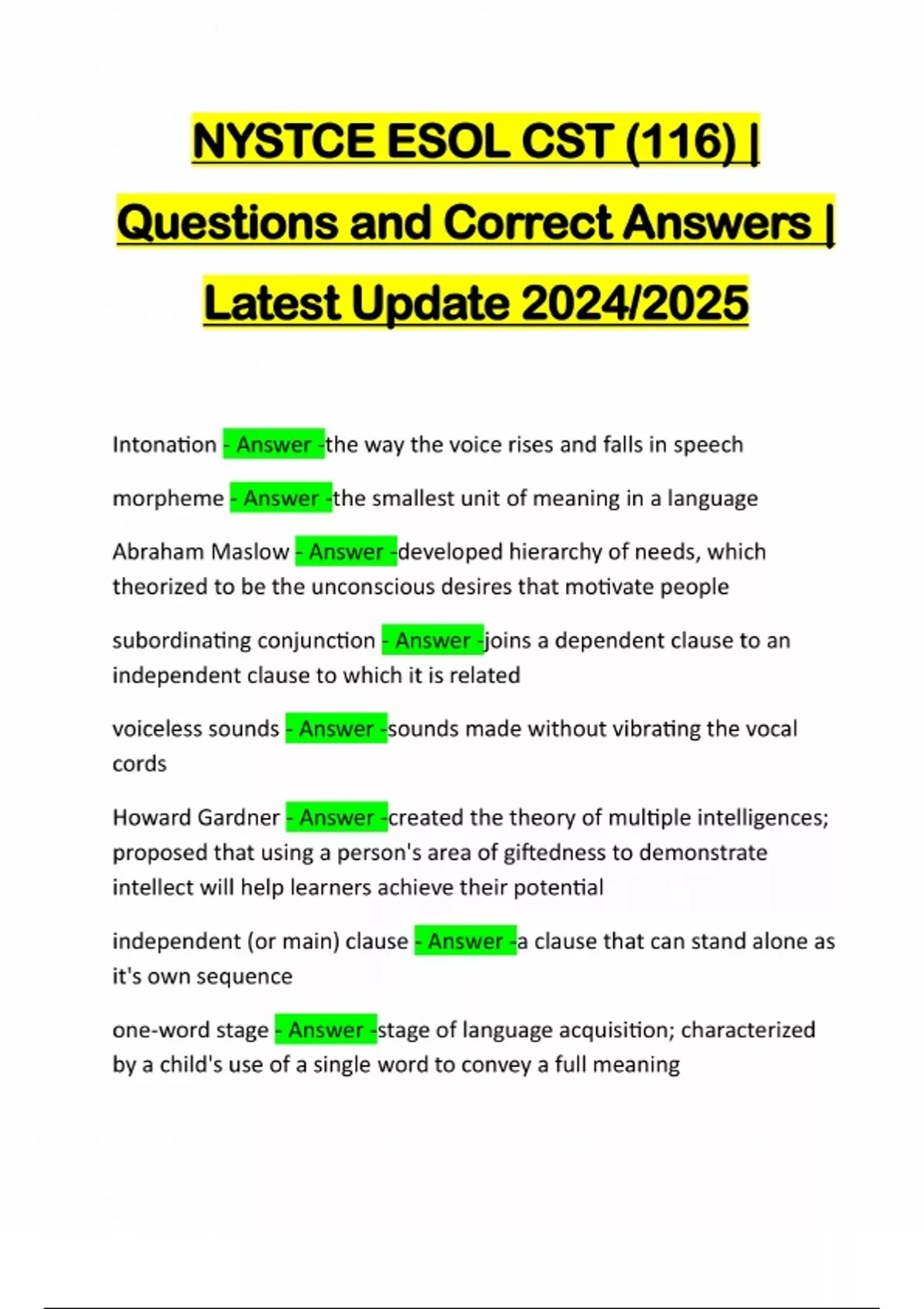 NYSTCE ESOL CST (116) | Questions and Correct Answers | Latest Update 2024/2025