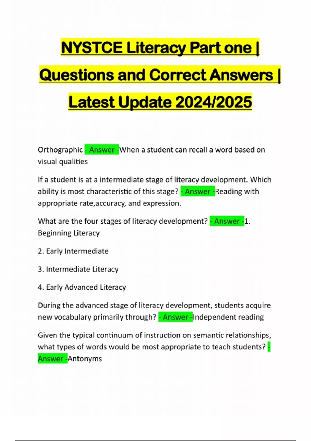 NYSTCE Literacy Part one | Questions and Correct Answers | Latest Update 2024/2025