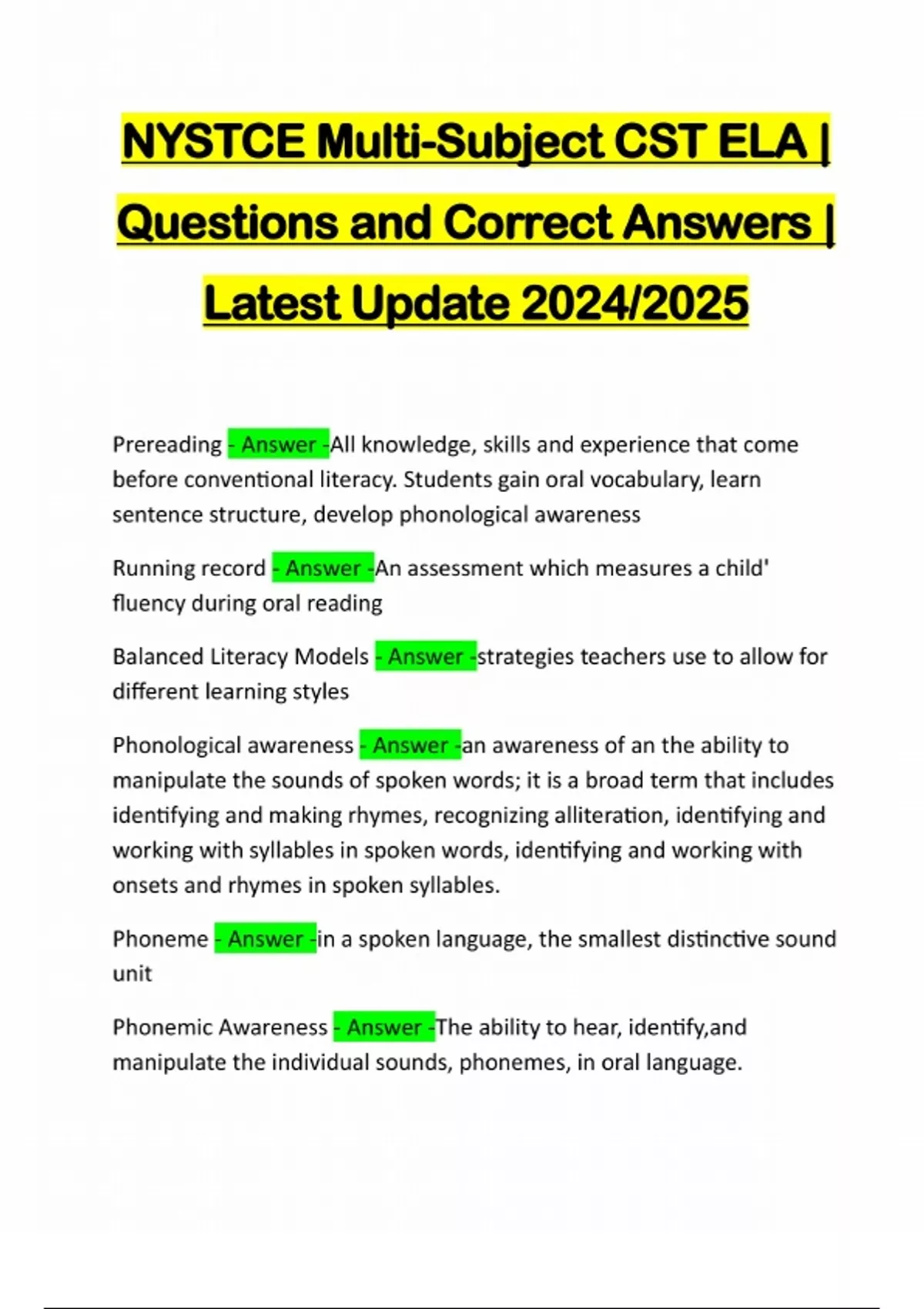 NYSTCE Multi-Subject CST ELA | Questions and Correct Answers | Latest Update 2024/2025 Prereading - Answer -All knowledge, skills and experience that come before conventional literacy. Students gain oral vocabulary, learn sentence structure, develop phonological awareness Running record - Answer -An assessment which measures a child' fluency during oral reading Balanced Literacy Models - Answer -strategies teachers use to allow for different learning styles Phonological awareness - Answer -an awareness of an the ability to manipulate the sounds of spoken words; it is a broad term that includes identifying and making rhymes, recognizing alliteration, identifying and working with syllables in spoken words, identifying and working with onsets and rhymes in spoken syllables. Phoneme - Answer -in a spoken language, the smallest distinctive sound unit Phonemic Awareness - Answer -The ability to hear, identify,and manipulate the individual sounds, phonemes, in oral language.5 Major Types of Tasks to develop Phonemic Awareness - Answer -1. Recognize sets of works have similar sounds (identifying rhyming words in a sentence) 2. Learn to examine a set of words to determine which is not like the others, oddity task) 3. Learn how to blend sounds to create words 4. Divide words into their phonemes (segmenting words) and count the number of sounds in a word 5. Learn how to manipulate the sounds in a word by substituting or deleting one or many phonemes Print Concept - Answer -Understanding how text works to communicate a message. Includes handing of books and orientation of text. Ways to facilitate print concepts - Answer -Combining movement activities to convey bottom, top side. Teach the parts of a book. Experiences with different fonts and text sizes and the different meanings they have. Spacing. Writing exercises. Use of meta-language to descibe books. Track Print - Answer -student understands the direction of the text Alphabet Recognition - Answer -being able to identify the letters of th