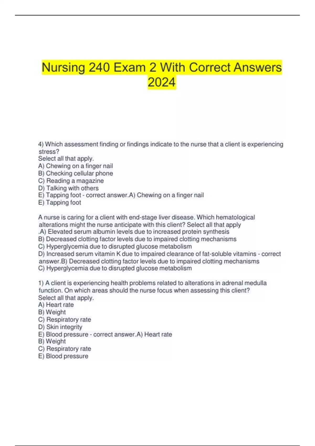 Nursing 240 Exam 2 With Correct Answers 2024