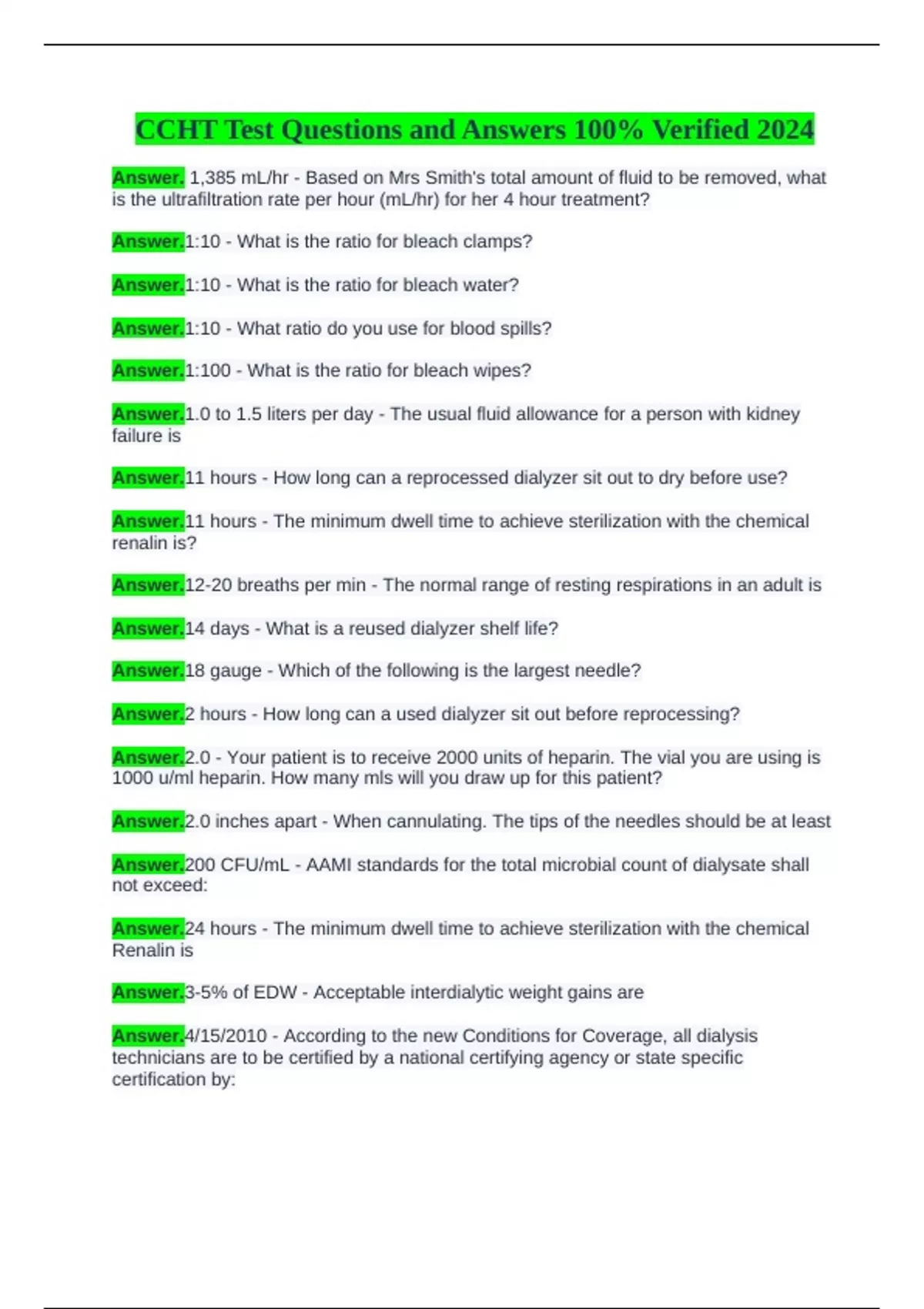 Answer. 1,385 mL/hr - Based on Mrs Smith's total amount of fluid to be removed, what is the ultrafiltration rate per hour (mL/hr) for her 4 hour treatment? Answer.1:10 - What is the ratio for bleach clamps? Answer.1:10 - What is the ratio for bleach water? Answer.1:10 - What ratio do you use for blood spills? Answer.1:100 - What is the ratio for bleach wipes? Answer.1.0 to 1.5 liters per day - The usual fluid allowance for a person with kidney failure is Answer.11 hours - How long can a reprocessed dialyzer sit out to dry before use? Answer.11 hours - The minimum dwell time to