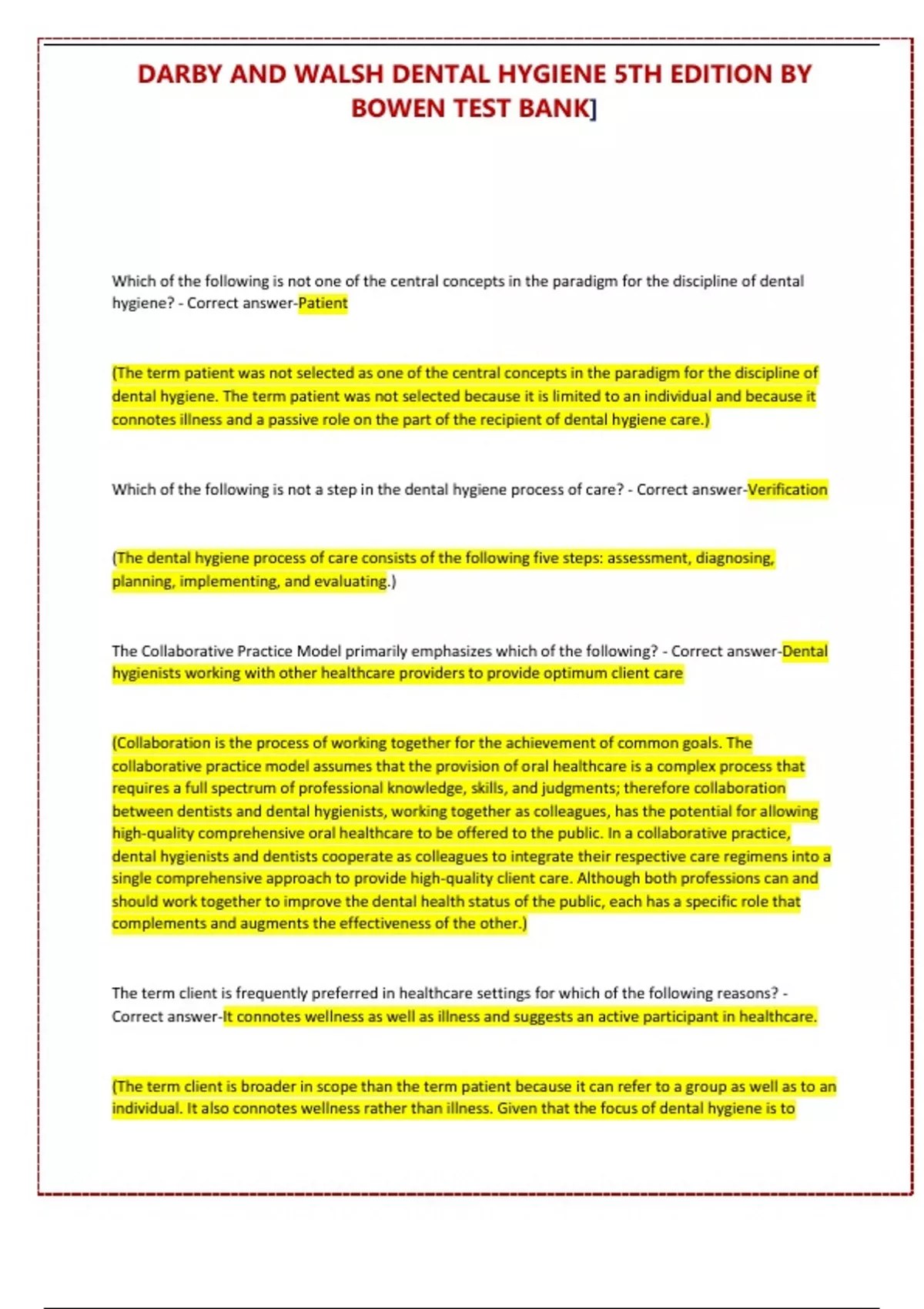 Which of the following is not a step in the dental hygiene process of care? - Correct answer-Verification