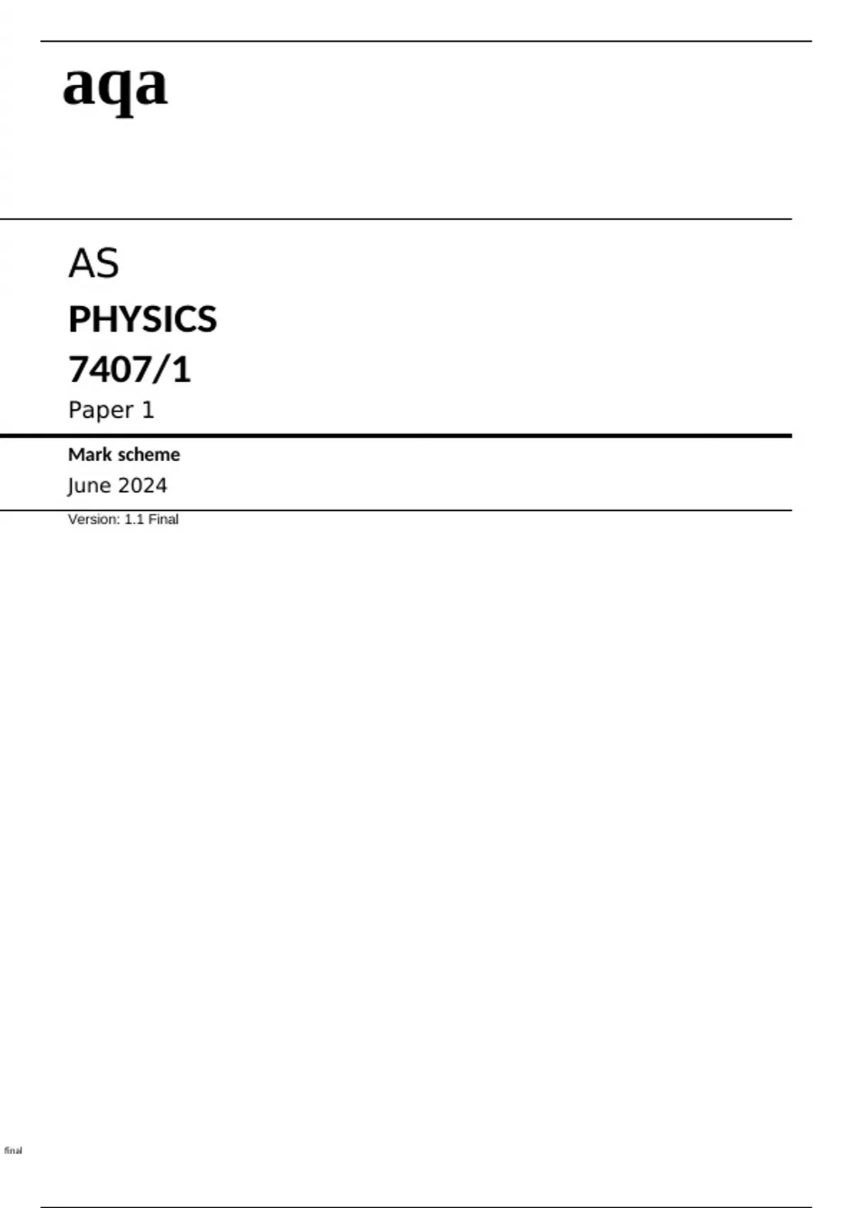 aqa AS PHYSICS (7407/1) Paper 1 June 2024 Mark Scheme