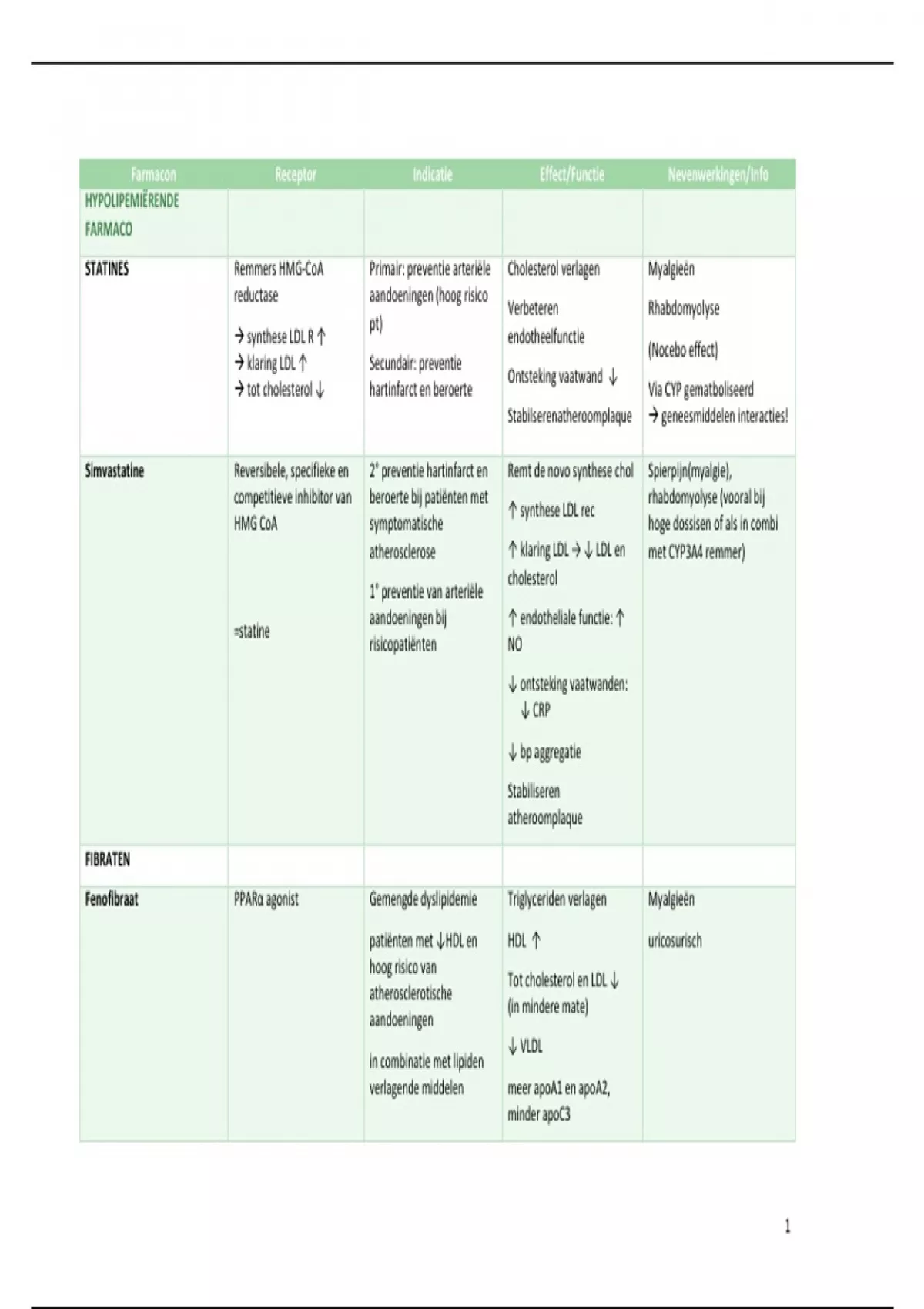 Simvastatine Reversibele, specifieke en 2° preventie hartinfarct en Remt de novo synthese chol Spierpijn(myalgie),