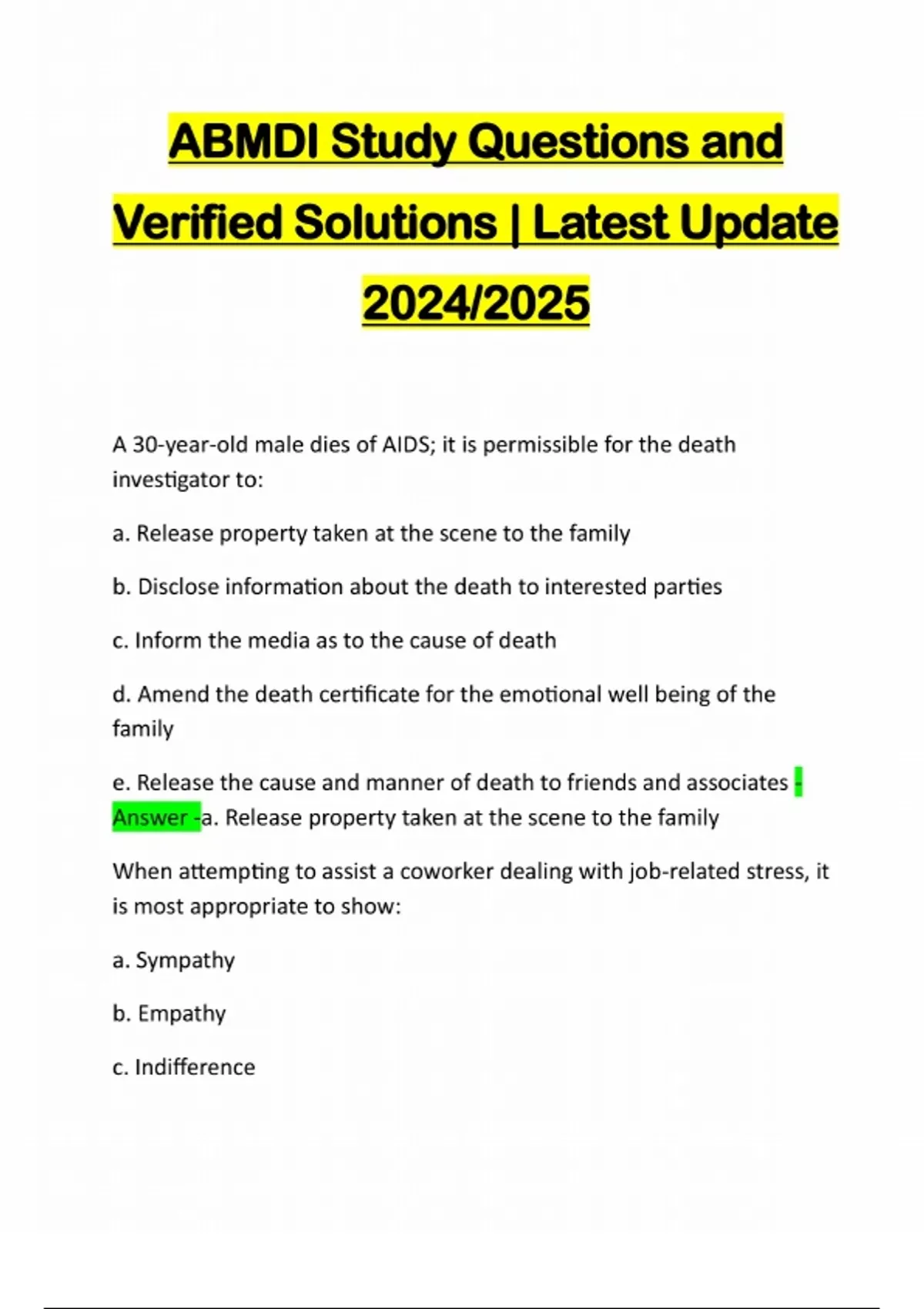 ABMDI Study Questions and Verified Solutions | Latest Update 2024/2025 A 30-year-old male dies of AIDS; it is permissible for the death investigator to: a. Release property taken at the scene to the family b. Disclose information about the death to interested parties c. Inform the media as to the cause of death d. Amend the death certificate for the emotional well being of the family e. Release the cause and manner of death to friends and associates - Answer -a. Release property taken at the scene to the family When attempting to assist a coworker dealing with job-related stress, it is most appropriate to show: a. Sympathy b. Empathy c. Indifferenced. Sarcasm e. Tenacity - Answer -b. Empathy After you have completed an investigation at a private residence, the family calls your office to report the theft of personal property from their residence. How should you handle the situation?: a. Adamantly deny the theft of personal property b. Place blame on the first responde