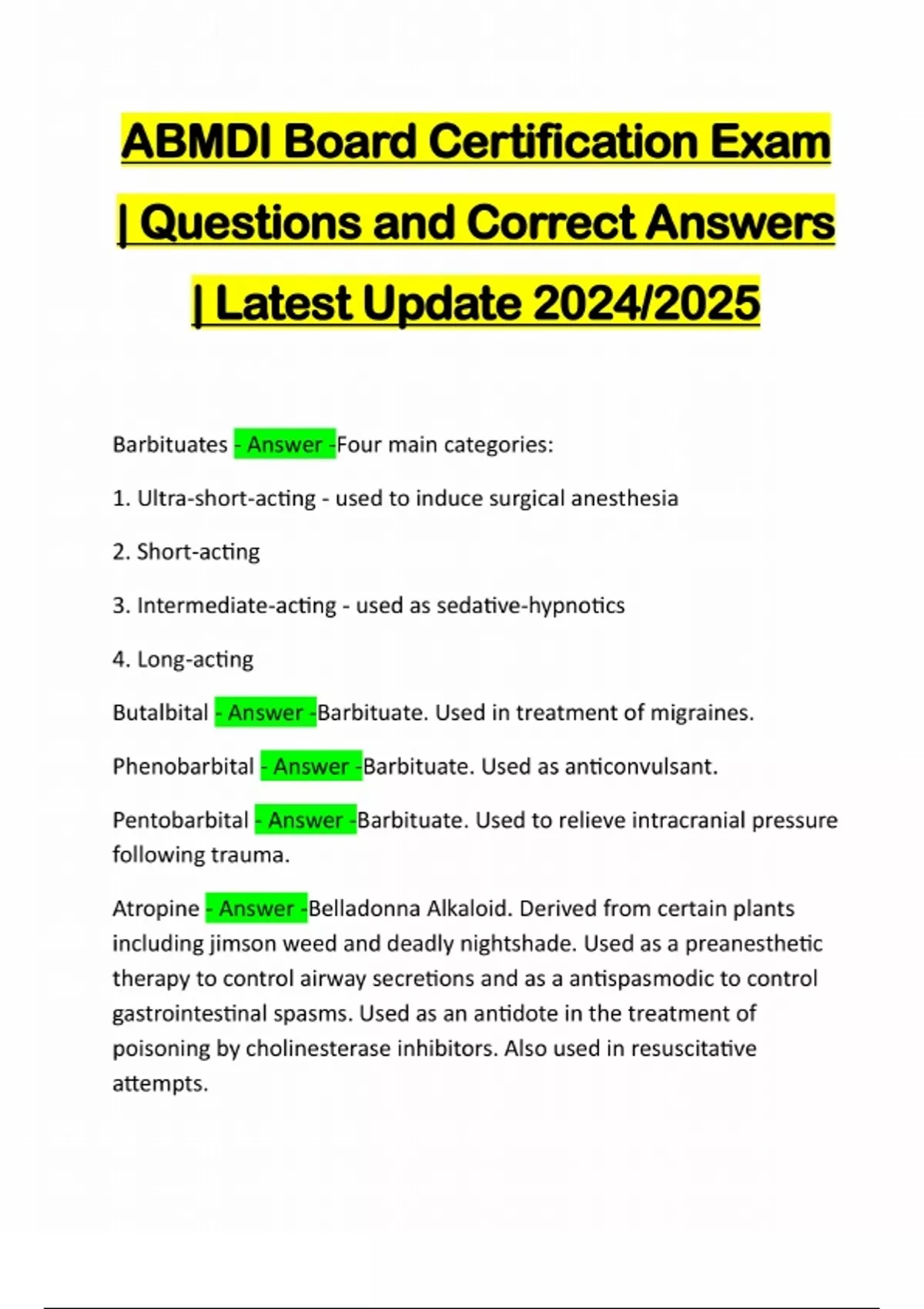 ABMDI Board Certification Exam | Questions and Correct Answers | Latest Update 2024/2025 Barbituates - Answer -Four main categories: 1. Ultra-short-acting - used to induce surgical anesthesia 2. Short-acting 3. Intermediate-acting - used as sedative-hypnotics 4. Long-acting Butalbital - Answer -Barbituate. Used in treatment of migraines. Phenobarbital - Answer -Barbituate. Used as anticonvulsant. Pentobarbital - Answer -Barbituate. Used to relieve intracranial pressure following trauma. Atropine - Answer -Belladonna Alkaloid. Derived from certain plants including jimson weed and deadly nightshade. Used as a preanesthetic therapy to control airway secretions and as a antispasmodic to control gastrointestinal spasms. Used as an antidote in the treatment of poisoning by cholinesterase inhibitors. Also used in resuscitative attempts.Toxic effects: mydriasis, hot dry reddened skin, delirium, and hallucinations. Scopalamine - Answer -Belladonna Alkaloid. Derived from jimson weed and henbane. Used as a preanesthetic, treatment of Parkinsonism, gastrointestinal disorders, and prevention of motion sickness. Toxic effects: Blurred vision, dryness of throat, dilated pupils, somnolence, mydriasis, skin flushing, hallucinations, and confusion. Benzodiazepines - Answer -Belladonna Alka