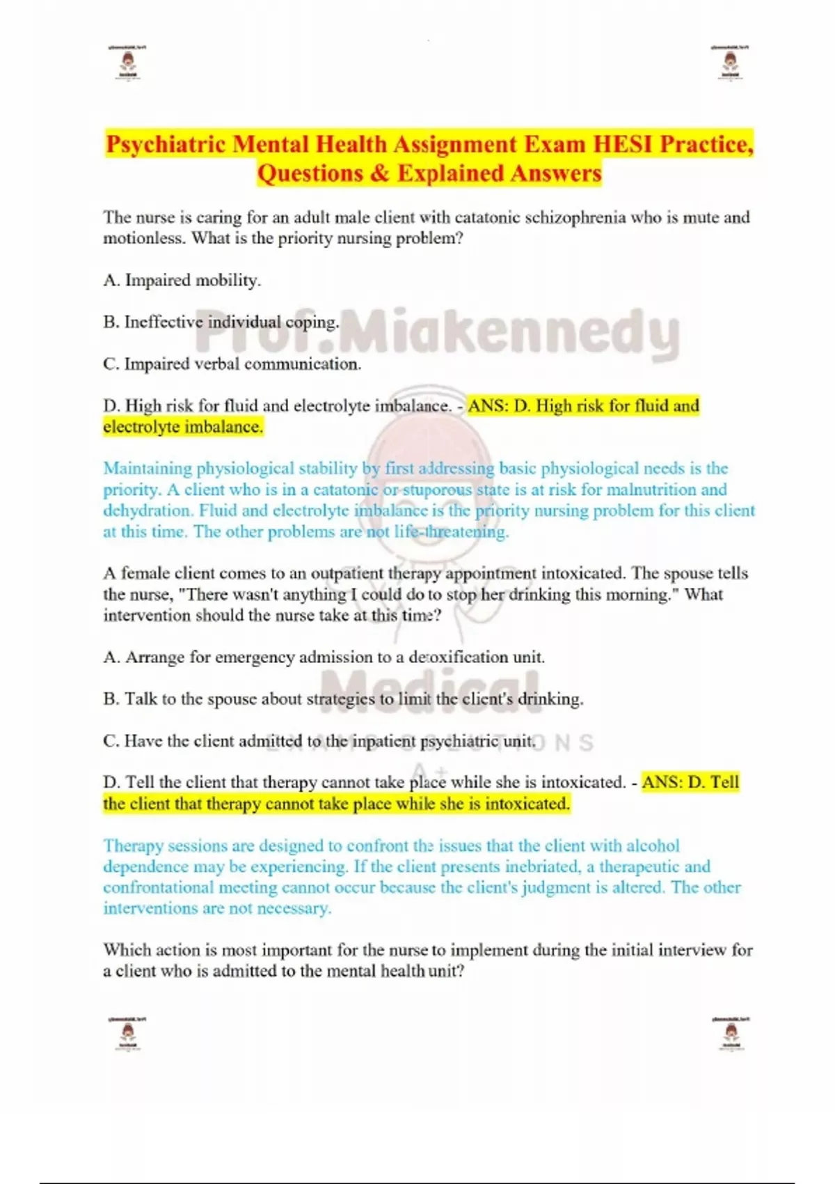 Psychiatric Mental Health Assignment Exam HESI Practice, Questions & Explained Answers-The nurse is caring for an adult male client with catatonic schizophrenia who is mute and motionless. What is the priority nursing problem? A. Impaired mobility. B. Ineffective individual coping. C. Impaired verbal communication. D. High risk for fluid and electrolyte imbalance. - ANS: D. High risk for fluid and electrolyte imbalance. Maintaining physiological stability by first addressing basic physiological needs is the priority. A client who is in a catatonic or stuporous state is at risk for malnutrition and dehydration. Fluid and electrolyte imbalance is the priority nursing problem for this client at this time. The other problems are not life-threatening. A female client comes to an outpatient therapy appointment intoxicated. The spouse tells the nurse, "There wasn't anything I could do to stop her drinking this morning." What intervention should the nurse take at this time? A. Arrange for emergency admission to a detoxification unit. B. Talk to the spouse about strategies to limit the client's drinking. C. Have the client admitted to the inpatient psychiatric unit. D. Tell the client that therapy cannot take place while she is intoxicated. - ANS: D. Tell the client that therapy cannot take place while she is intoxicated. Therapy sessions are designed to confront the issues that the client with alcohol dependence may be experiencing. If the client presents inebriated, a therapeutic and confrontational meeting cannot occur because the client's judgment is altered. The other interventions are not necessary. Which action is most important for the nurse to implement during the initial interview for a client who is admitted to the mental health unit? A. Establish rapport in each phase of the nurse-client relationship. B. Determine the client's ability to communicate effectively. C. Reflect on previous psychiatric interviews the nurse has performed. D. Ensure data is collected and recorded in a systematic sequence. - ANS: A. Establish rapport in each phase of the nurse-client relationship. A client with whom the nurse establishes rapport during the initial interview and in each phase of the nurse-client relationship feels understood by the nurse and is more likely to cooperate and provide feedback during the admission process. The other actions not always needed to establish rapport or maintain the therapeutic self in a therapeutic relationship. The nurse is planning the care for a client based on the psychoanalytical model. Which intervention should the nurse include in the plan of care? A. Emphasize the client's strengths and assets. B. Teach the importance of medication compliance. C. Offer the client psychoeducational materials to read. D. Focus on the client's positive or negative feelings toward the nurse. - ANS: D. Focus on the client's positive or negative feelings toward the nurse. Interactions and interventions that focus on the client's positive or negative feelings toward the nurse are based on the psychoanalytical model of mental health care. The other interventions are not associated with the psychoanalytical model. A client on the mental health unit reports concerns about weight gain as a result of taking divalproex (Depakote) and requests assistance to fill out a menu. The nurse should initiate a referral to which healthcare team member? A. Occupational therapist. B. Recreational therapist. C. Dietician. D. Physician. - ANS: C. Dietician. The nurse should ask for a referral to the dietician who can assist the client with meal planning for weight reduction. The other members of the healthcare team do not give guidance about meal planning. Which client should the nurse identify as the highest risk for the onset of stress-related problems? A. A man whose new business is growing slowly, who plans to adopt a child with his wife, and says, "I think I'm in control of my destiny." B. A woman who is graduating from college, getting married in one month, and states, "I'm anticipating the changes these events will make in my life." C. A client who is passed over for promotion, quits a job to start a new business, and states, "This is just one of a series of challenges I've faced in my life." D. A person whose father died three months ago, who is losing a job due to company downsizing, and states, "Living with loss and the threat of loss makes me feel helpless." - ANS: D. A person whose father died three months ago, who is losing a job due to company downsizing, and states, "Living with loss and the threat of loss makes me feel helpless." A client who is dealing with two stressful life events and expresses a cognitive appraisal of loss and helplessness is at the highest risk for a stress-related health problem. The other persons are coping with change using healthy strategies. An older client is admitted to a psychiatric hospital with the diagnosis, "Major depression, single episode." Which laboratory value is most important for the nurse to report to the healthcare provider immediately? A. Increased serum creatinine level. B. Positive rapid plasma reagin (RPR). C. Increased thyroid stimulating hormone (TSH). D. Elevated serum calcium level. - ANS: C. Increased thyroid stimulating hormone (TSH). The healthcare provider should be notified of TSH levels immediately. An increased TSH suggests a low thyroxine level because TSH is being secreted to stimulate thyroxine production, which is the pathophysiology of hypothyroidism that may present as depression. The other results should be evaluated but do not have the priority relative to the admission diagnosis.