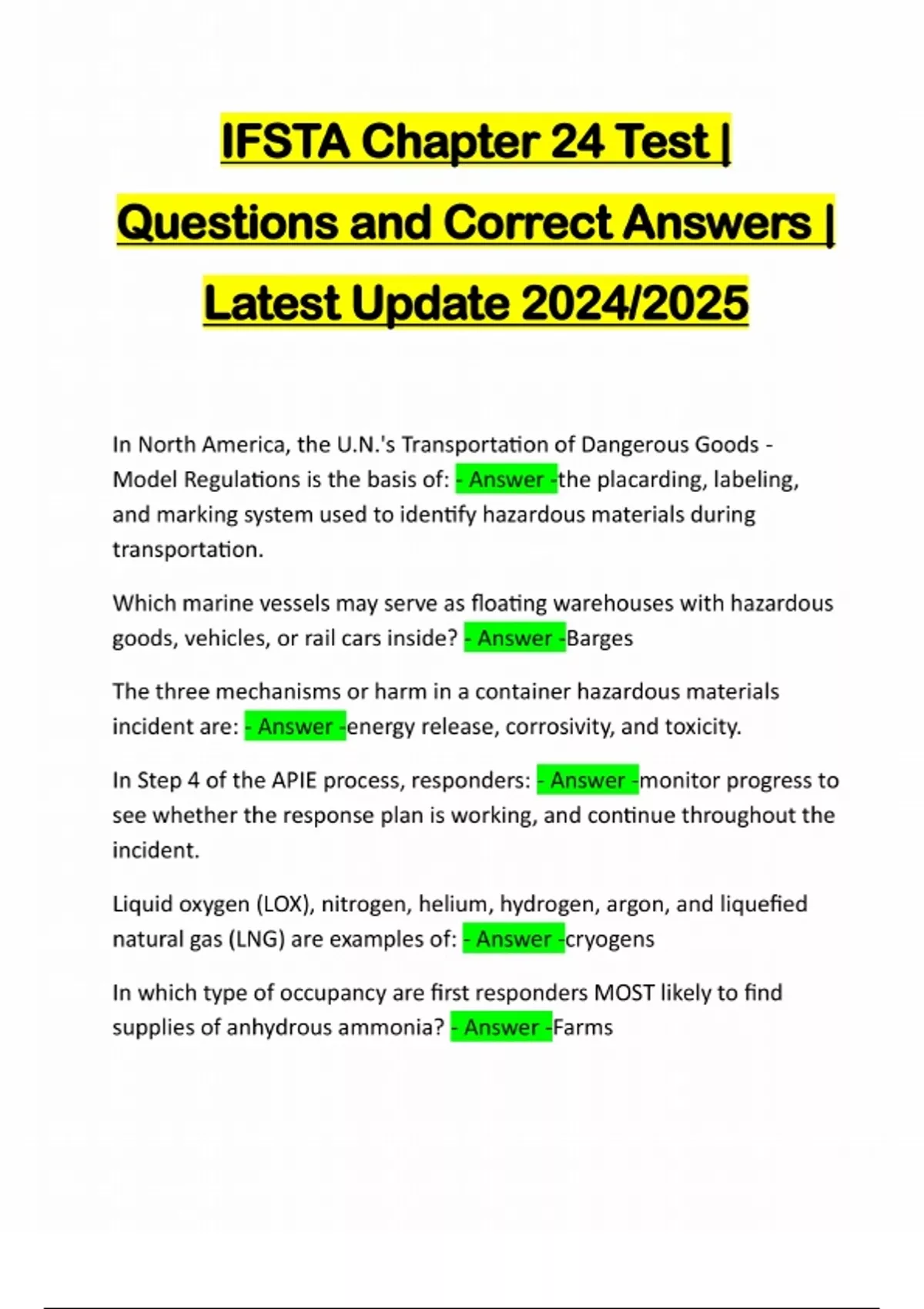 IFSTA Chapter 24 Test | Questions and Correct Answers | Latest Update 2024/2025 In North America, the U.N.'s Transportation of Dangerous Goods - Model Regulations is the basis of: - Answer -the placarding, labeling, and marking system used to identify hazardous materials during transportation. Which marine vessels may serve as floating warehouses with hazardous goods, vehicles, or rail cars inside? - Answer -Barges The three mechanisms or harm in a container hazardous materials incident are: - Answer -energy release, corrosivity, and toxicity. In Step 4 of the APIE process, responders: - Answer -monitor progress to see whether the response plan is working, and continue throughout the incident. Liquid oxygen (LOX), nitrogen, helium, hydrogen, argon, and liquefied natural gas (LNG) are examples of: - Answer -cryogens In which type of occupancy are first responders MOST likely to find supplies of anhydrous ammonia? - Answer -FarmsWhich type of ionizing radiation consists of high-energy photons? - Answer -Gamma Materials with very little radioactivity that present no risk to the public should be shipped using what type of packaging? - Answer -Excepted Most hazmat incidents, such as gasoline and diesel fuel spills, involve what hazard class? - Answer -Class 3 In the U.N. system, hazard classes are divided int