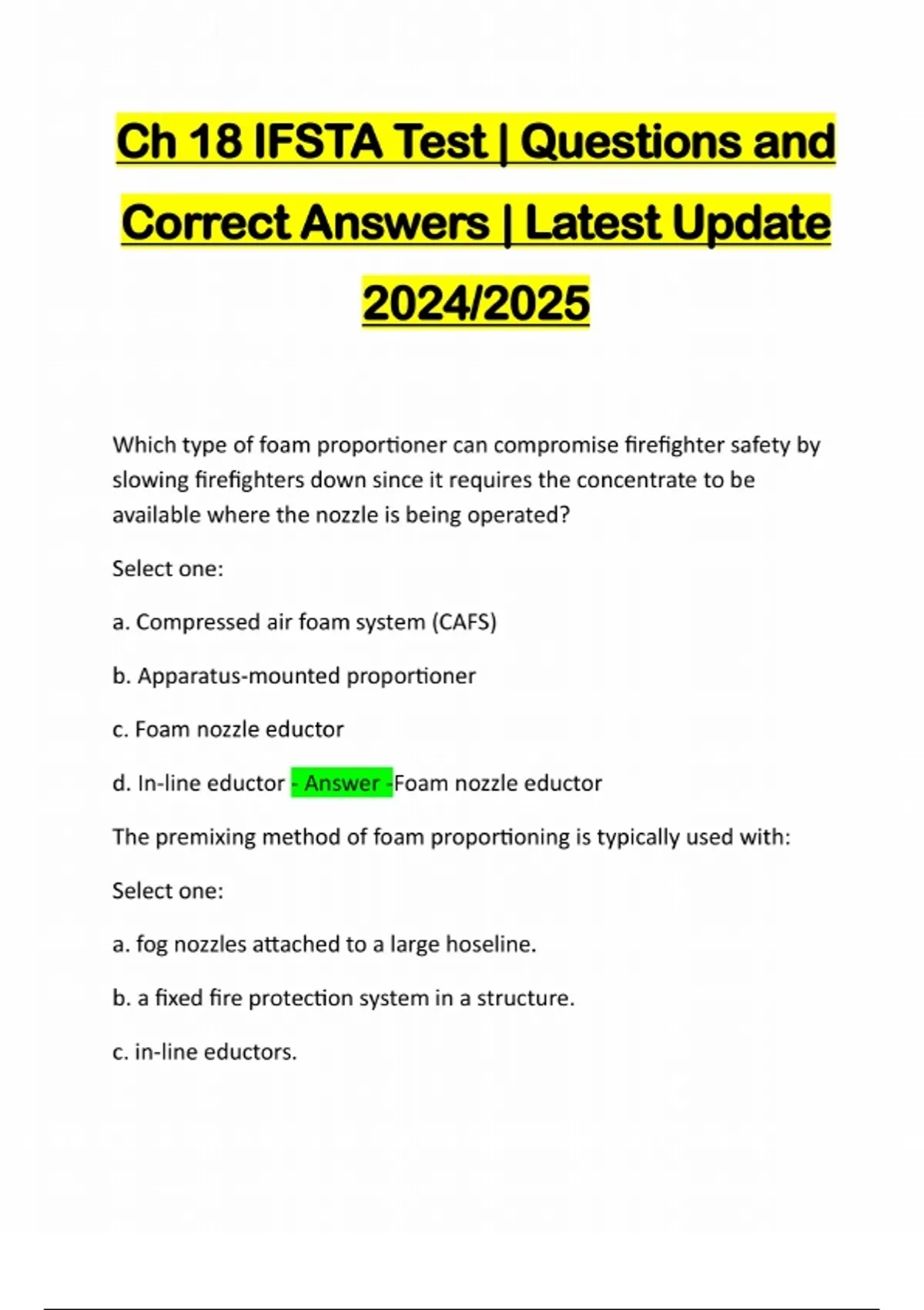 Ch 18 IFSTA Test | Questions and Correct Answers | Latest Update 2024/2025 Which type of foam proportioner can compromise firefighter safety by slowing firefighters down since it requires the concentrate to be available where the nozzle is being operated? Select one: a. Compressed air foam system (CAFS) b. Apparatus-mounted proportioner c. Foam nozzle eductor d. In-line eductor - Answer -Foam nozzle eductor The premixing method of foam proportioning is typically used with: Select one: a. fog nozzles attached to a large hoseline. b. a fixed fire protection system in a structure. c. in-line eductors.d. vehicle-mounted tank systems. - Answer -vehicle-mounted tank systems. Which method of foam application is only suitable for use on a pool of liquid fuel on open ground? Select one: a. Roll-on method b. Spread-over method
