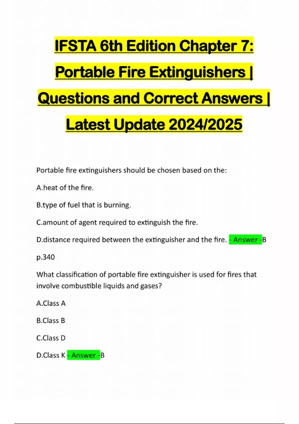 IFSTA 6th Edition Chapter 7: Portable Fire Extinguishers | Questions and Correct Answers | Latest Update 2024/2025 Portable fire extinguishers should be chosen based on the: A.heat of the fire. B.type of fuel that is burning. C.amount of agent required to extinguish the fire. D.distance required between the extinguisher and the fire. - Answer -B p.340 What classification of portable fire extinguisher is used for fires that involve combustible liquids and gases? A.Class A B.Class B C.Class D D.Class K - Answer -Bp.341 What classification of portable fire extinguisher is used for fires that involve combustible metals and alloys? A.Class A B.Class B