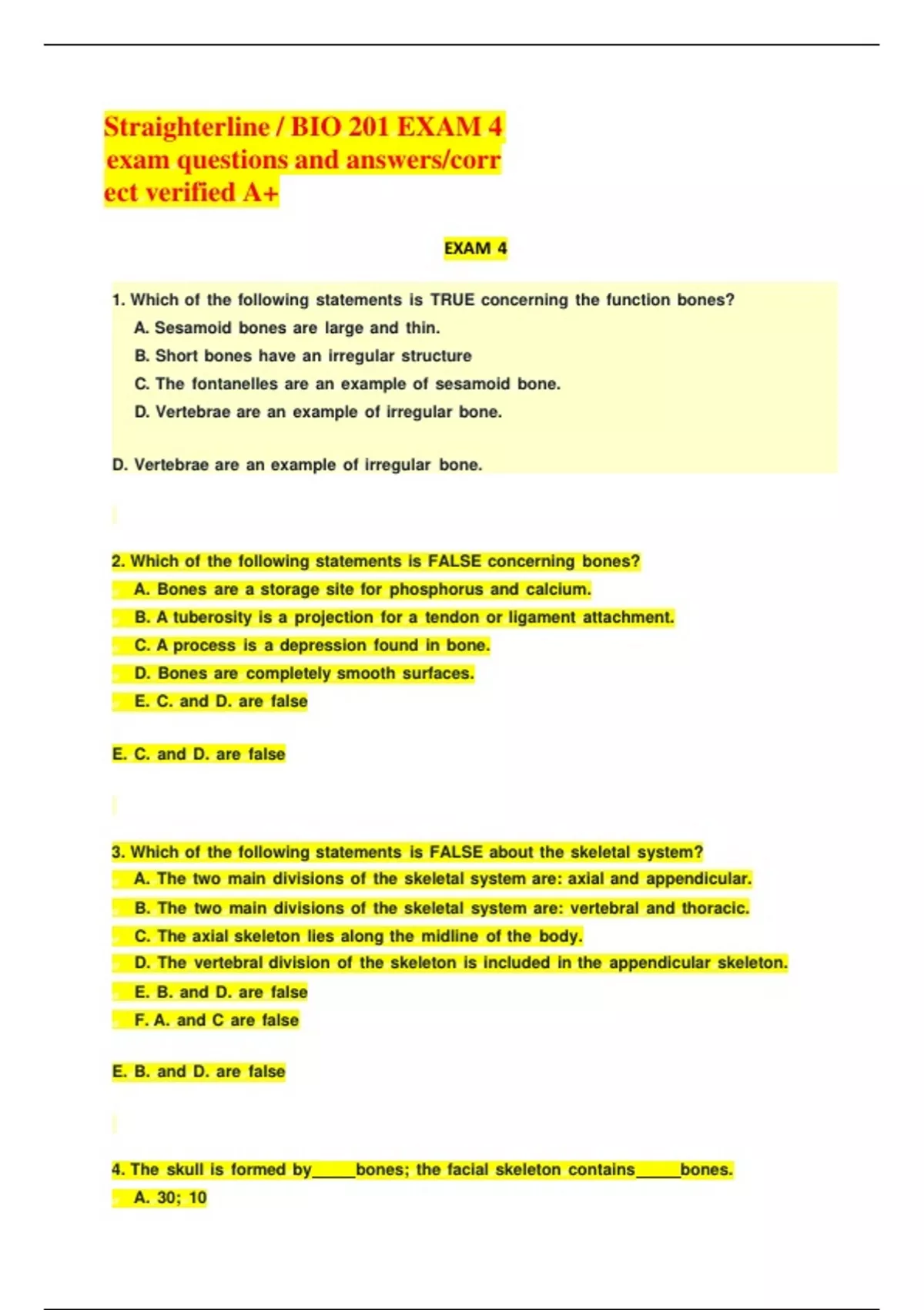 Straighterline / BIO 201 EXAM 4Straighterlinegf/gfBIOgf201gfEXAMgf4gfexamgfquestionsgfandgfanswers/correctgfverifiedgfA+ EXAMgf4 2. WhichgfofgfthegffollowinggfstatementsgfisgfFALSEgfconcerninggfbones? gf A.gfBonesgfaregfagfstoragegfsitegfforgfphosphorusgfandgfcalcium. gf B.gfAgftuberositygfisgfagfprojectiongfforgfagftendongforgfligamentgfattachment. gf C.gfAgfprocessgfisgfagfdepressiongffoundgfingfbone. gf D.gfBonesgfaregfcompletelygfsmoothgfsurfaces. gf E.gfC.gfandgfD.gfaregffalse E.gfC.gfandgfD.gfaregffalse 3. WhichgfofgfthegffollowinggfstatementsgfisgfFALSEgfaboutgfthegfskeletalgfsystem? gf A.gfThegftwogfmaingfdivisionsgfofgfthegfskeletalgfsystemgfare:gfaxialgfandgfappendicular. gf B.gfThegftwogfmaingfdivisionsgfofgfthegfskeletalgfsystemgfare:gfvertebralgfandgfthoracic. gf C.gfThegfaxialgfskeletongfliesgfalonggfthegfmidlinegfofgfthegfbody. gf D.gfThegfvertebralgfdivisiongfofgfthegfskeletongfisgfincludedgfingfthegfappendiculargfskeleton. gf E.gfB.gfandgfD.gfaregffalse gf F.gfA.gfandgfCgfaregffalse E.gfB.gfandgfD.gfaregffalse 4. Thegfskullgfisgfformedgfby bones;gfthegffacialgfskeletongfcontains bones. gf A.gf30;gf10 gf B.gf22;gf14 gf C.gf10;gf5 gf D.gf15;gf7 B.gf22;gf14 5. Whatgfbonegfisgfhighlightedgfingfbluegfingfthegffiguregfbelow?gf(superior/internalgfview) Sphenoidgfbone Labelgfthegffollowinggfvertebraegfas:gfA=gfCervical B=gfThoracicgfC=gfLumbar Bgf(Thoracic) 2: Externalgfacousticgfmeatus 3: Stylomastoidgfforamen