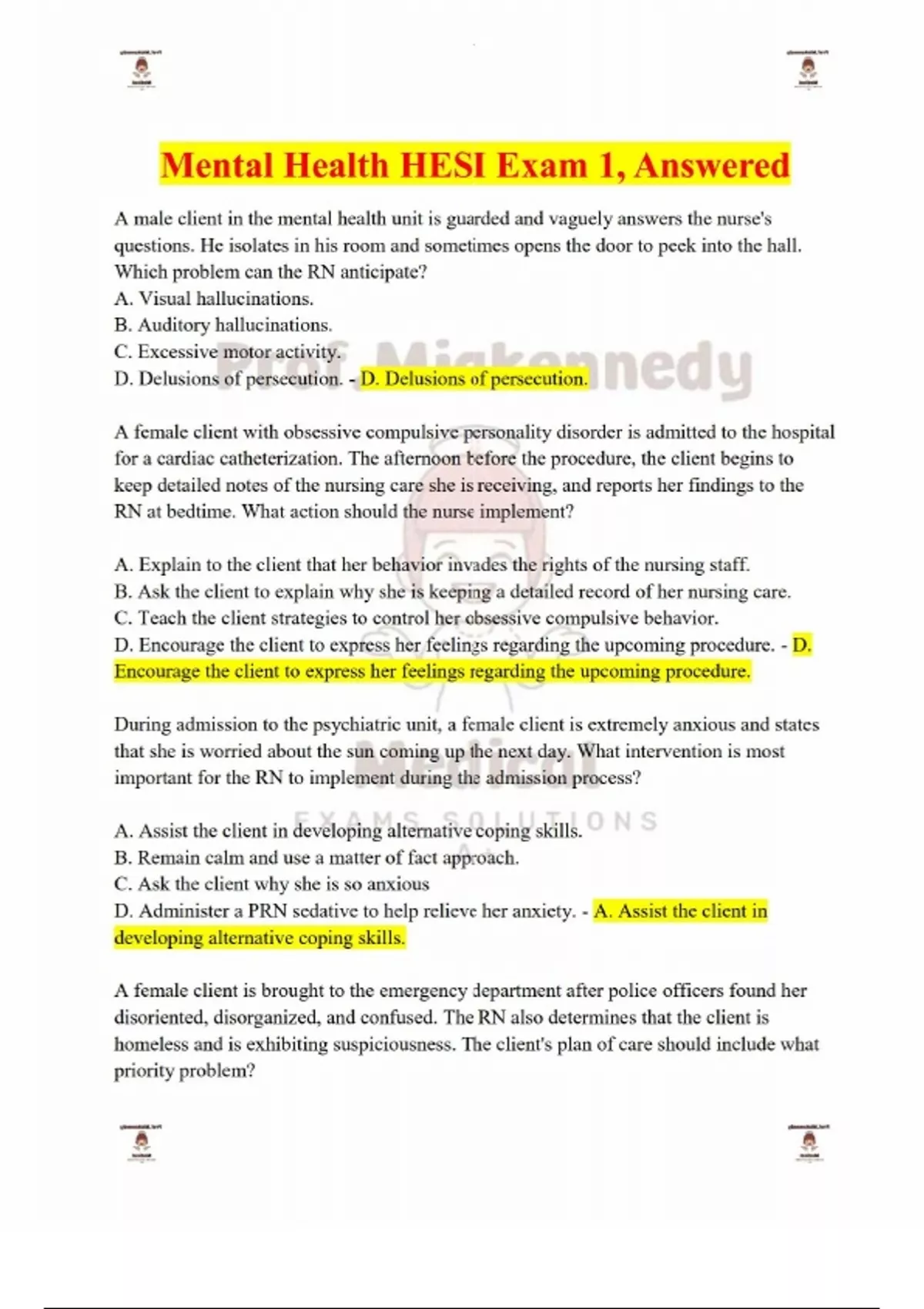 Mental Health HESI Exam 1 2024/2025, Answered-A male client in the mental health unit is guarded and vaguely answers the nurse's questions. He isolates in his room and sometimes opens the door to peek into the hall. Which problem can the RN anticipate? A. Visual hallucinations. B. Auditory hallucinations. C. Excessive motor activity. D. Delusions of persecution. - D. Delusions of persecution. A female client with obsessive compulsive personality disorder is admitted to the hospital for a cardiac catheterization. The afternoon before the procedure, the client begins to keep detailed notes of the nursing care she is receiving, and reports her findings to the RN at bedtime. What action should the nurse implement? A. Explain to the client that her behavior invades the rights of the nursing staff. B. Ask the client to explain why she is keeping a detailed record of her nursing care. C. Teach the client strategies to control her obsessive compulsive behavior. D. Encourage the client to express her feelings regarding the upcoming procedure. - D. Encourage the client to express her feelings regarding the upcoming procedure. During admission to the psychiatric unit, a female client is extremely anxious and states that she is worried about the sun coming up the next day. What intervention is most important for the RN to implement during the admission process? A. Assist the client in developing alternative coping skills. B. Remain calm and use a matter of fact approach. C. Ask the client why she is so anxious D. Administer a PRN sedative to help relieve her anxiety. - A. Assist the client in developing alternative coping skills. A female client is brought to the emergency department after police officers found her disoriented, disorganized, and confused. The RN also determines that the client is homeless and is exhibiting suspiciousness. The client's plan of care should include what priority problem? A. Acute confusion. B. Ineffective community coping C. Disturbed sensory perception. D. Self-care deficit. - A. Acute confusion. The occupational health nurse is working with a female employee who was just notified that her child was involved in a MVA and taken to the hospital. The employee states, "I can't believe this. What should I do?" Which response is best for the RN to provide in this crisis? A. Tell me what you think should happen. B. How serious was the collision? C. What do you think you should do? D. Call for transportation to the hospital. - D. Call for transportation to the hospital. A client tells the RN that he has an IQ of 400+ and is a genius and an inventor. He also reports that he is married to a female movie star and thinks that his brother wants a sexual relationship with her. What is the priority nursing problem for admission to the psychiatric unit? A. Ineffective sexual patterns. B. Impaired environmental interpretation. C. Disturbed sensory perception. D. Compromised family coping. - A. Ineffective sexual patterns. The RN is providing care for a client diagnosed with borderline personality disorder who has self-inflicted lacerations on the abdomen. Which approach should the RN use when changing this client's dressing? A. Provide detailed thorough explanations when cleansing wound. B. Perform the dressing change in a non-judgmental manner. C. Ask in a non-threatening manner why the client cut own abdomen. D. Request another staff member assist with the dressing change. - B. Perform the dressing change in a non-judgmental manner. While sitting in the day room of the mental health unit, a male adolescent avoids eye contact,looks at the floor, and talks softly when interacting verbally with the RN. The two trade places,and the RN demonstrates the client's behaviors. What is the main goal of this therapeutic technique? A. Initiate a non-threatening conversation with the client. B. Dialog about the ineffectiveness of his interactions. C. Allow the client to identify the way he interacts. D. Discuss the client's feelings when he responds. - C. Allow the client to identify the way he interacts.