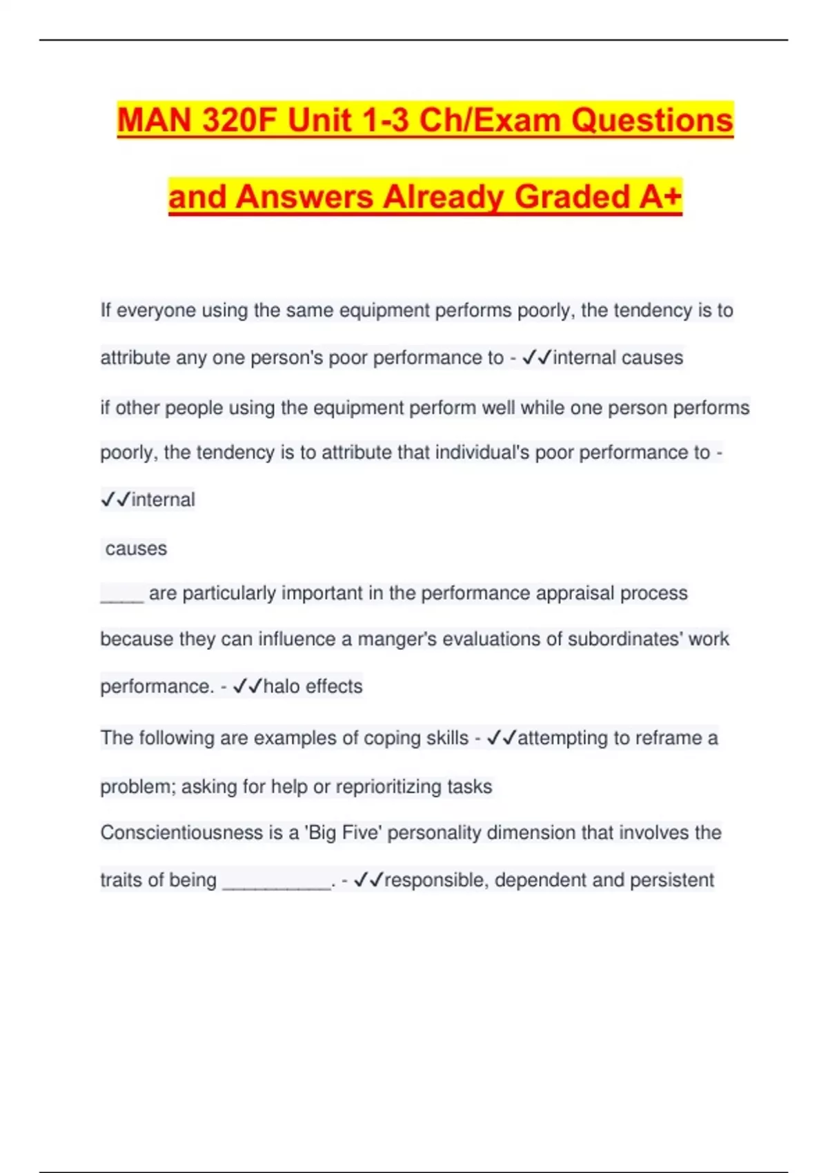 MAN 320F Unit 1-3 Ch/Exam Questions and Answers Already Graded A+ If everyone using the same equipment performs poorly, the tendency is to attribute any one person's poor performance to - internal causes if other people using the equipment perform well while one person performs poorly, the tendency is to attribute that individual's poor performance to - internal causes ____ are particularly important in the performance appraisal process because they can influence a manger's evaluations of subordinates' work performance. - halo effects The following are examples of coping skills - attempting to reframe a problem; asking for help or reprioritizing tasks Conscientiousness is a 'Big Five' personality dimension that involves the traits of being __________. - responsible, dependent and persistent