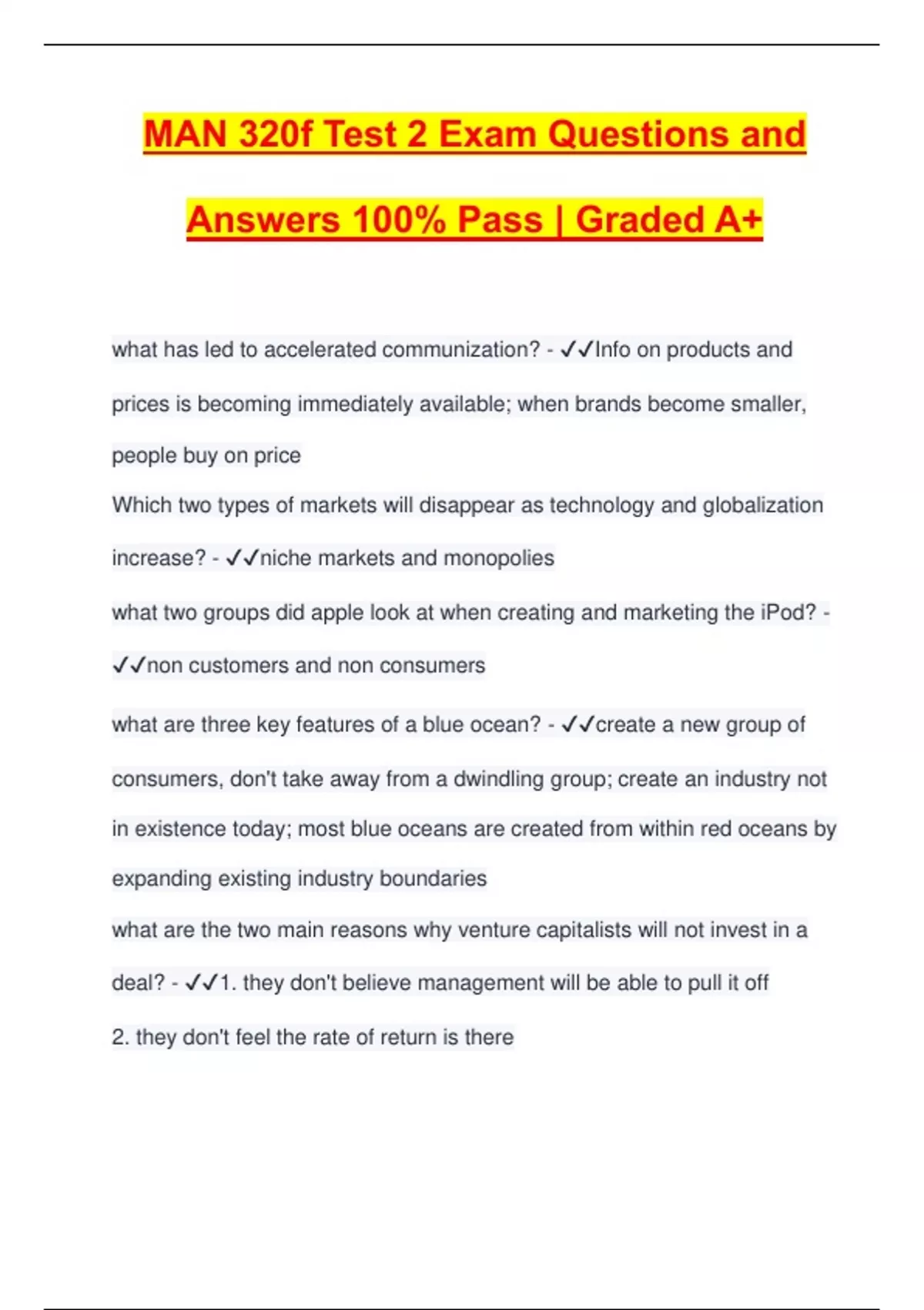 MAN 320f Test 2 Exam Questions and Answers 100% Pass | Graded A+ what has led to accelerated communization? - Info on products and prices is becoming immediately available; when brands become smaller, people buy on price Which two types of markets will disappear as technology and globalization increase? - niche markets and monopolies what two groups did apple look at when creating and marketing the iPod? - non customers and non consumers what are three key features of a blue ocean? - create a new group of consumers, don't take away from a dwindling group; create an industry not in existence today; most blue oceans are created from within red oceans by expanding existing industry boundaries what are the two main reasons why venture capitalists will not invest in a deal? - 1. they don't believe management will be able to pull it off 2. they don't feel the rate of return is there