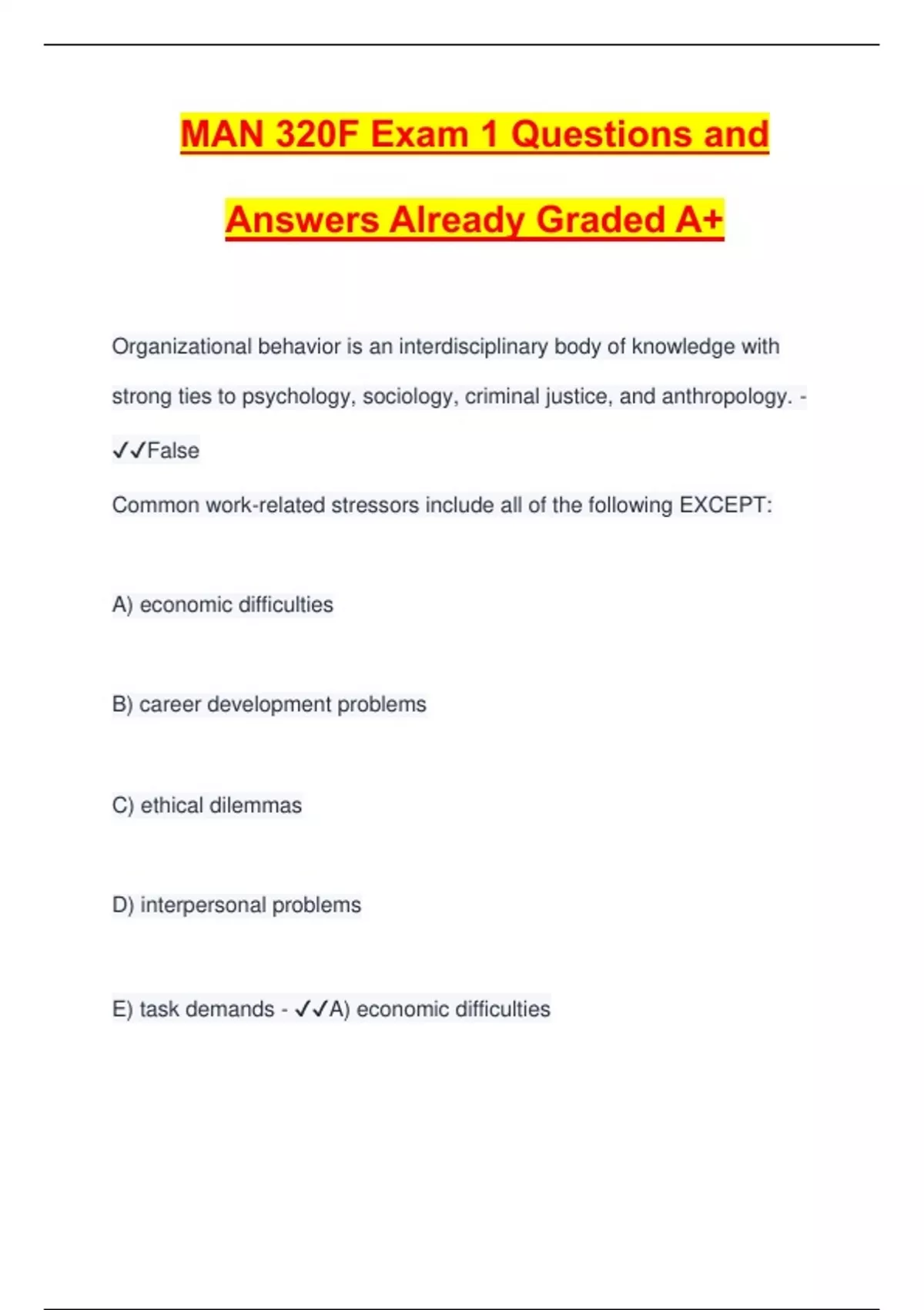 MAN 320F Exam 1 Questions and Answers Already Graded A+ Organizational behavior is an interdisciplinary body of knowledge with strong ties to psychology, sociology, criminal justice, and anthropology. - False Common work-related stressors include all of the following EXCEPT: A) economic difficulties B) career development problems C) ethical dilemmas D) interpersonal problems E) task demands - A) economic difficulties Commonly used organizational behavior research methods include case studies, survey studies, meta analyses, field studies, and laboratory studies. - True