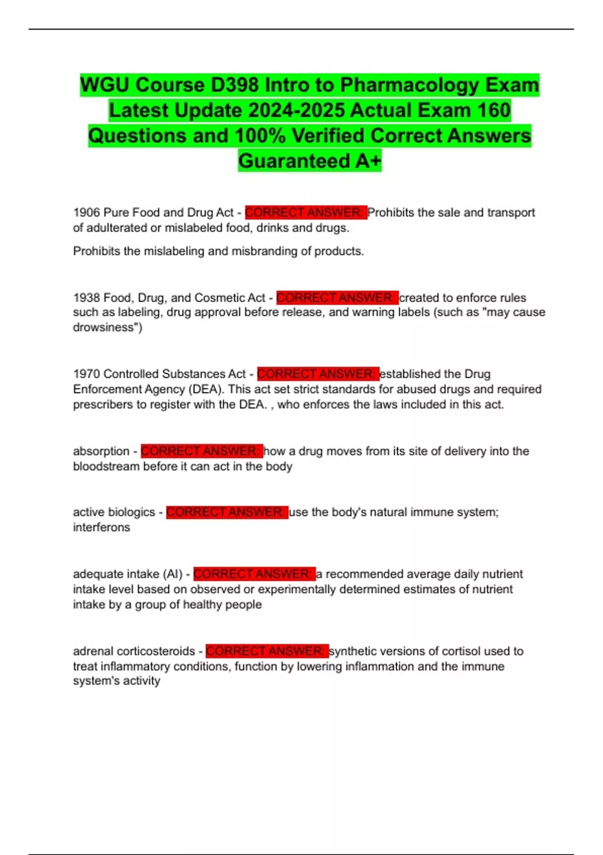 WGU Course D398 Intro to Pharmacology Exam Latest Update Actual Exam 160 Questions and 100% Verified Correct Answers Guaranteed A+