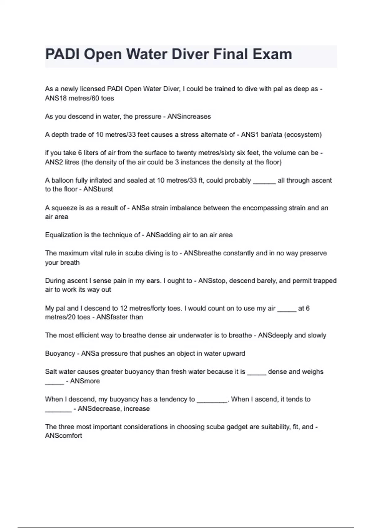 PADI Open Water Diver Final Exam questions with correct answers 2024/2025