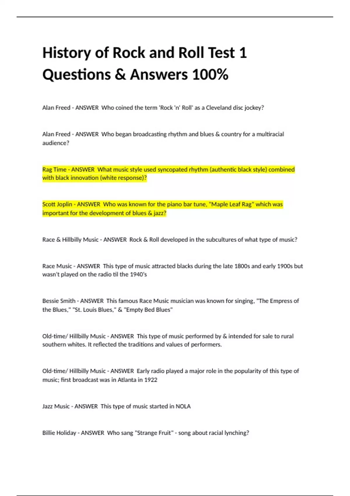 History of Rock and Roll Test 1 Questions & Answers 100%