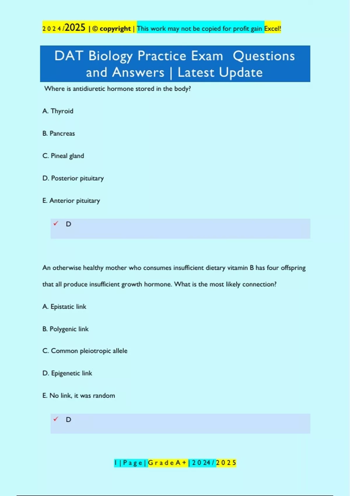 Where is antidiuretic hormone stored in the body? A. Thyroid B. Pancreas C. Pineal gland D. Posterior pituitary E. Anterior pituitary D An otherwise healthy mother who consumes insufficient dietary vitamin B has four offspring that all produce insufficient growth hormone. What is the most likely connection? A. Epistatic link B. Polygenic link C. Common pleiotropic allele D. Epigenetic link E. No link, it was random D 2 0 2 4 /2025 | © copyright | This work may not be copied for profit gain Excel! 1 | P a g e | G r a d e A + | 2 0 24 / 2 0 2 5 Which of the following transports minerals through the plant? A. Xylem B. Guard cells C. Cytokinins D. Ground tissue E. Phloem A Which of the following organisms has a predominantly haploid lifecycle? A. Mollusca B. Ferns C. Chordata D. Fungi E. Annelids D If a zebra is 2n = 18 and a horse is 2n = 24, what is the genetic makeup of the hybrid offspring? A. 2n = 18 2 0 2 4 /2025 | © copyright | This work may not be copied for profit gain Excel! 1 | P a g e | G r a d e A + | 2 0 24 / 2 0 2 5 B. 2n = 21 C. 2n = 22 D. 2n = 24 B