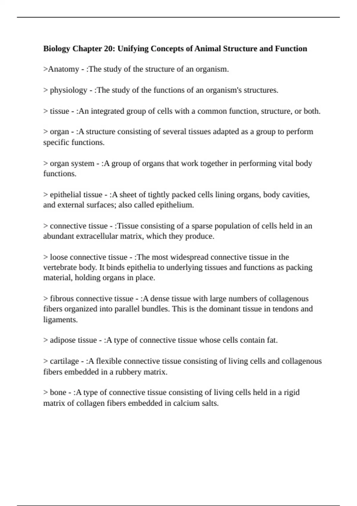 >Anatomy - :The study of the structure of an organism. > physiology - :The study of the functions of an organism's structures. > tissue - :An integrated group of cells with a common function, structure, or both. > organ - :A structure consisting of several tissues adapted as a group to perform specific functions. > organ system - :A group of organs that work together in performing vital body functions. > epithelial tissue - :A sheet of tightly packed cells lining organs, body cavities, and external surfaces; also called epithelium. > connective tissue - :Tissue consisting of a sparse population of cells held in an abundant extracellular matrix, which they produce. > loose connective tissue - :The most widespread connective tissue in the vertebrate body. It binds epithelia to underlying tissues and functions as packing material, holding organs in place. > fibrous connective tissue - :A dense tissue with large numbers of collagenous fibers organized into parallel bundles. This is the dominant tissue in tendons and ligaments. > adipose tissue - :A type of connective tissue whose cells contain fat. > cartilage - :A flexible connective tissue consisting of living cells and collagenous fibers embedded in a rubbery matrix. > bone - :A type of connective tissue consisting of living cells held in a rigid matrix of collagen fibers embedded in calcium salts.