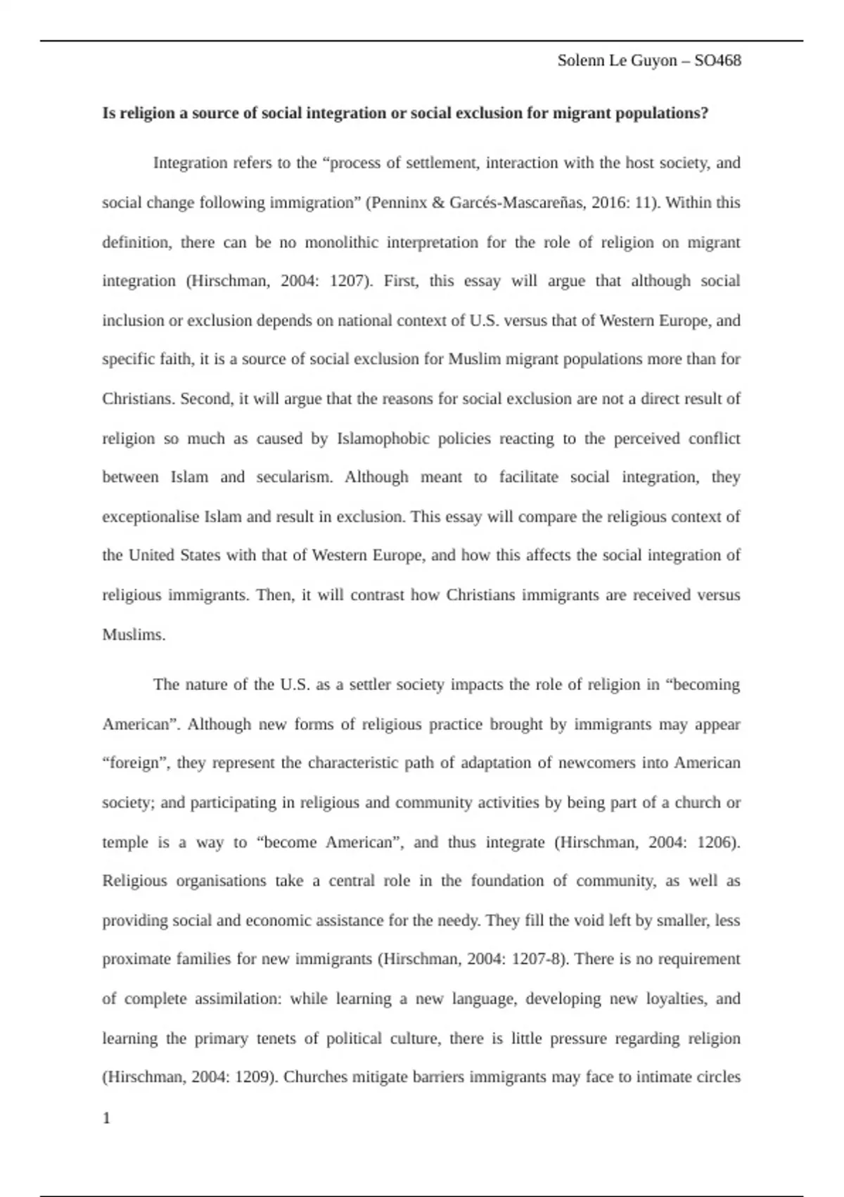 1,500 word formative essay - received very good feedback and is fully written, proofread and edited. About whether religion helps migrants to the west integrate within host societies or not. This essay features a comparison between the effect of religion of migrants in the US, and that of migrants to western Europe.