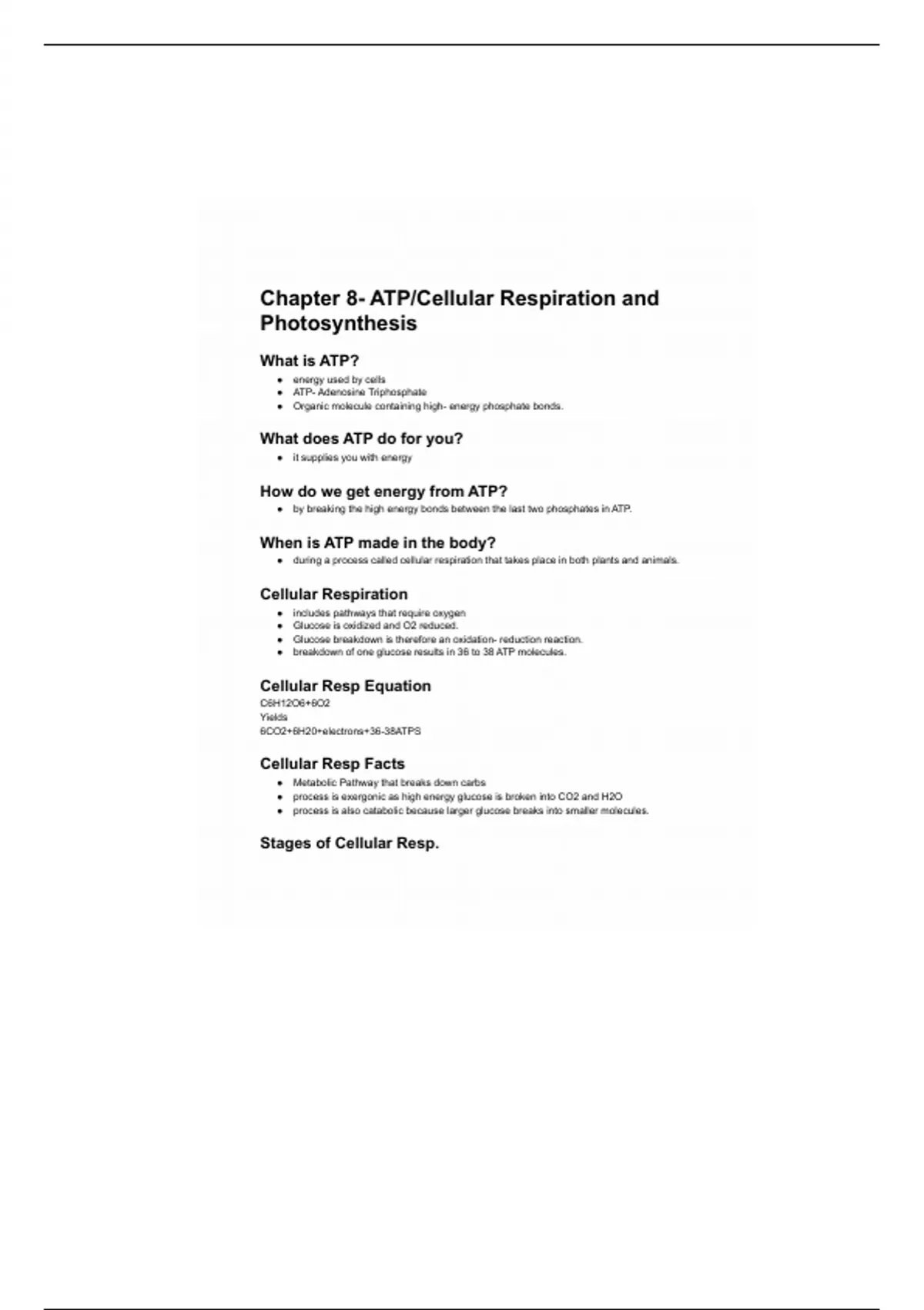 Chapter 8- ATP/Cellular Respiration and
