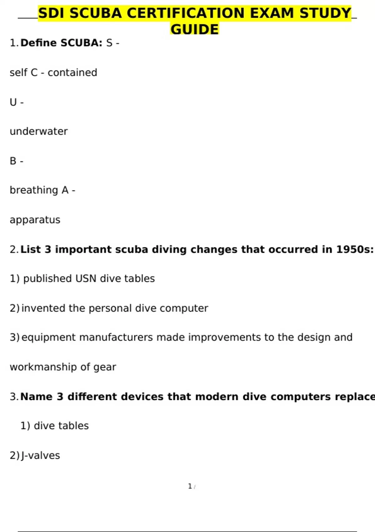 SDI SCUBA CERTIFICATION EXAM STUDY GUIDE 1. Define SCUBA: S - self C - contained U - underwater B - breathing A - apparatus 2. List 3 important scuba diving changes that occurred in 1950s: 1) published USN dive tables 2) invented the personal dive computer 3) equipment manufacturers made improvements to the design and workmanship of gear 3. Name 3 different devices that modern dive computers replace: 1) dive tables 2) J-valves 3) depth gauges 4. What sets SDI apart from other training