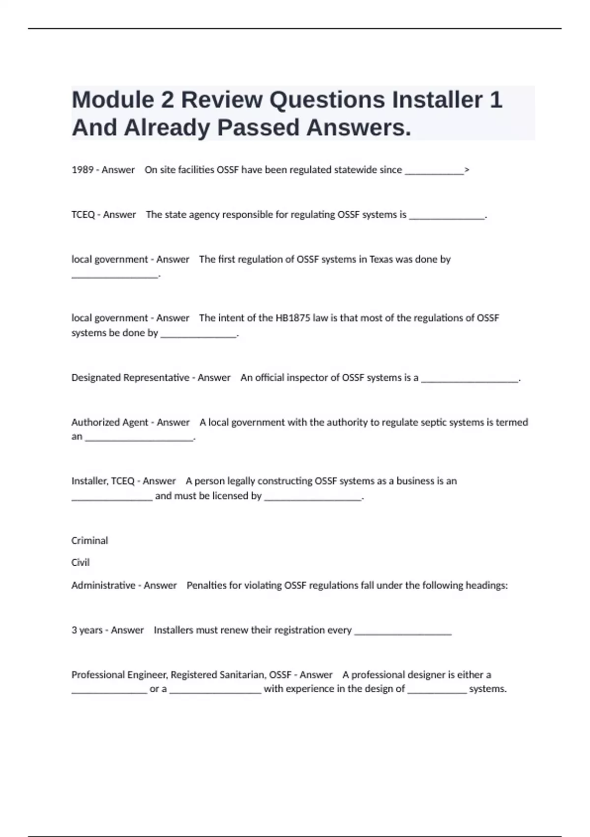 1989 - Answer On site facilities OSSF have been regulated statewide since ___________> TCEQ - Answer The state agency responsible for regulating OSSF systems is ______________. local government - Answer The first regulation of OSSF systems in Texas was done by ________________. local government - Answer The intent of the HB1875 law is that most of the regulations of OSSF systems be done by ______________. Designated Representative - Answer An official inspector of OSSF systems is a __________________. Authorized Agent - Answer A local government with the authority to regulate septic systems is termed an ____________________. Installer, TCEQ - Answer A person legally constructing OSSF systems as a business is an _______________ and must be licensed by __________________. Criminal Civil Administrative - Answer Penalties for violating OSSF regulations fall under the following headings: 3 years - Answer Installers must renew their registration every __________________ Professional Engineer, Registered Sanitarian, OSSF - Answer A professional designer is either a ______________ or a _________________ with experience in the design of ___________ systems