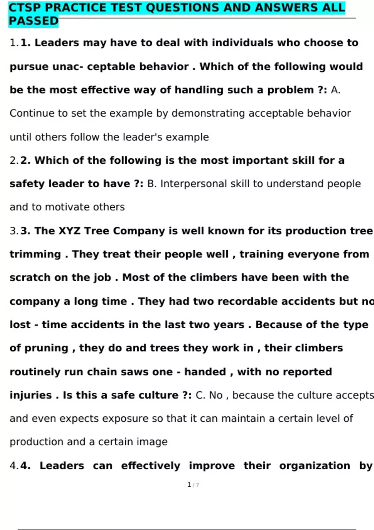 CTSP PRACTICE TEST QUESTIONS AND ANSWERS ALL PASSED 1. 1. Leaders may have to deal with individuals who choose to pursue unac- ceptable behavior . Which of the following would be the most effective way of handling such a problem ?: A. Continue to set the example by demonstrating acceptable behavior until others follow the leader's example 2. 2. Which of the following is the most important skill for a safety leader to have ?: B. Interpersonal skill to understand people and to motivate others