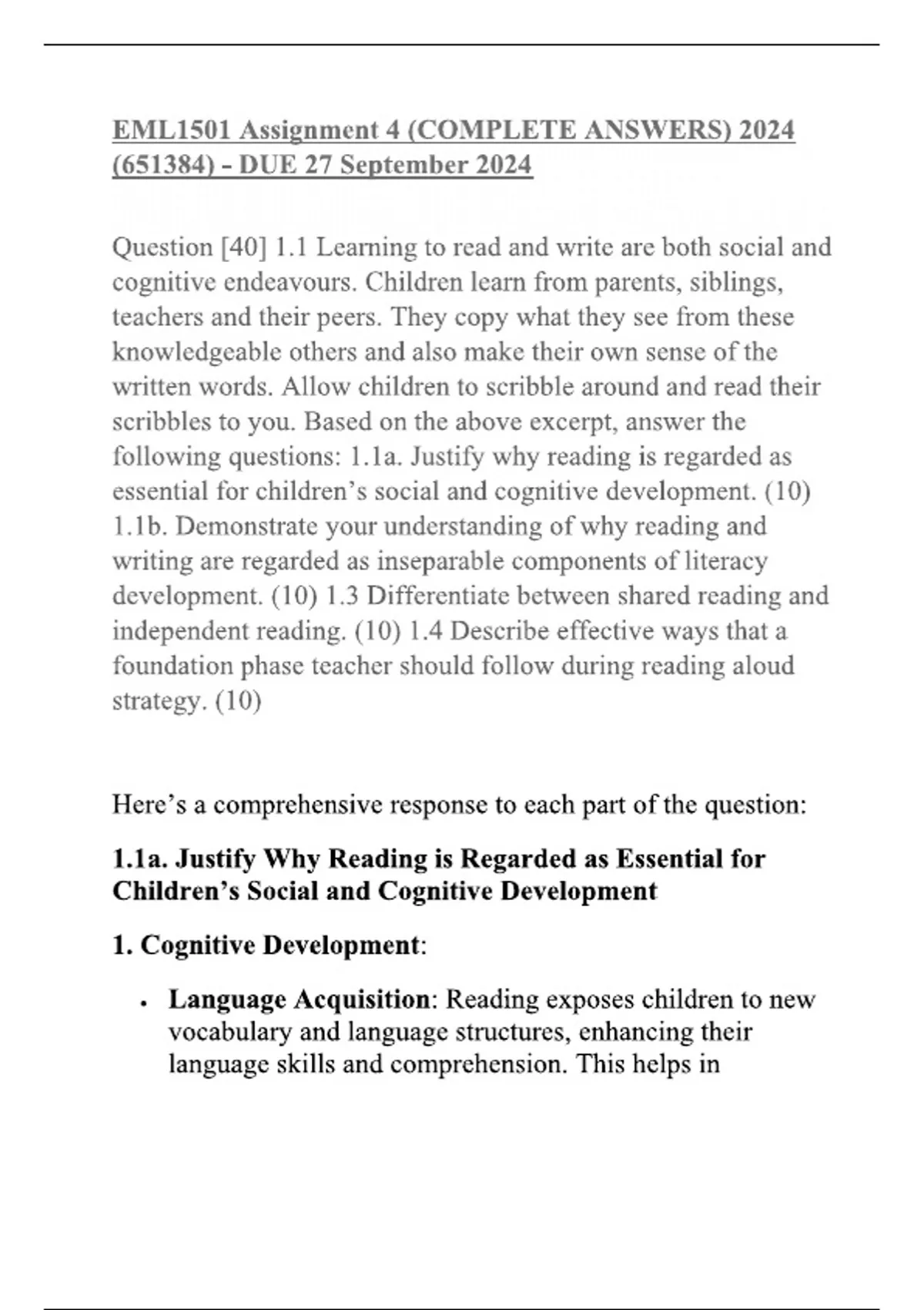 EML1501 Assignment 4 (COMPLETE ANSWERS) 2024 (651384) - DUE 27 September 2024 Course Emergent Literacy Institution University Of South Africa Book Emergent Literacy