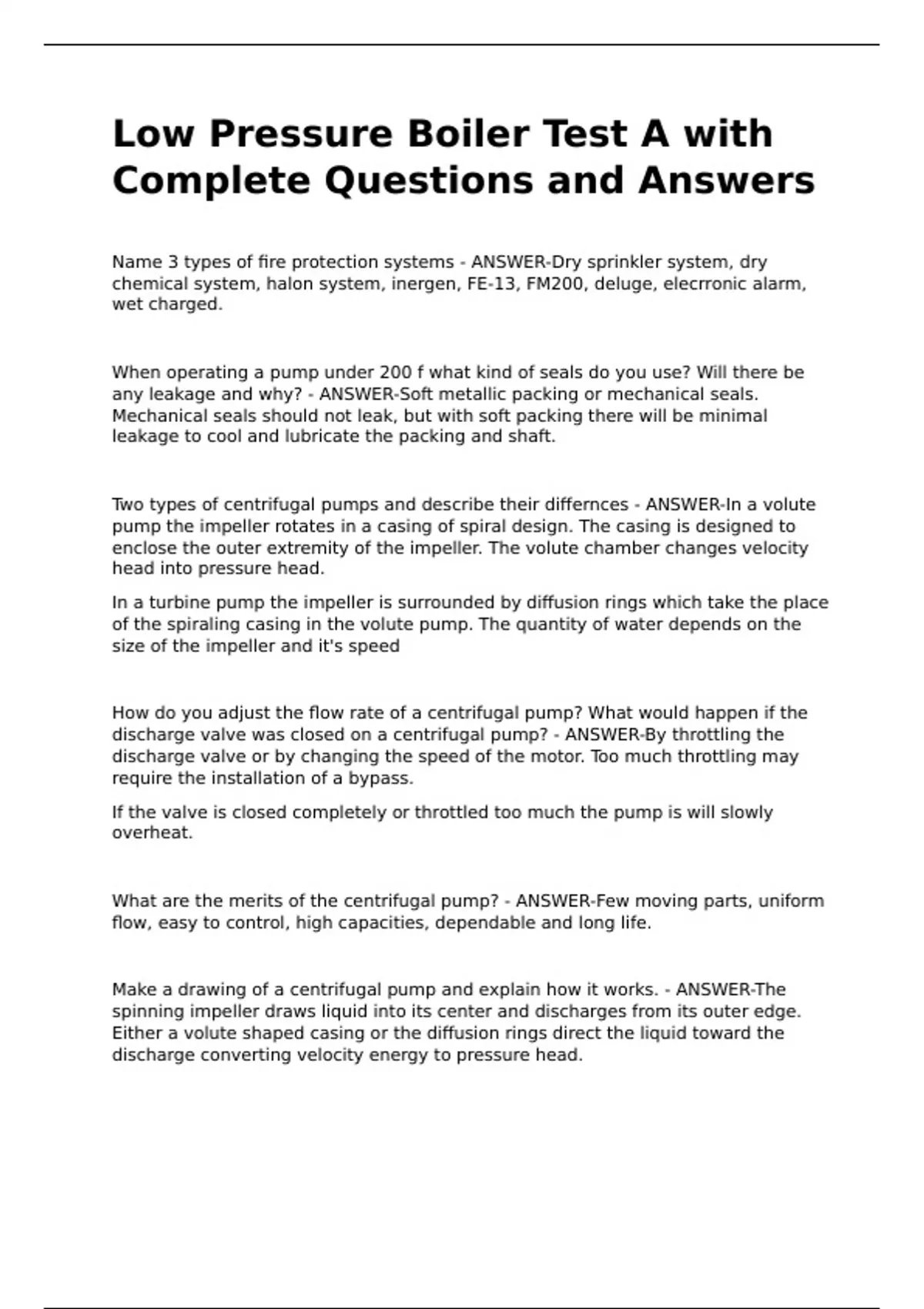 Low Pressure Boiler Test A with Complete Questions and Answers Low Pressure Boiler Test A with Complete Questions and Answers Low Pressure Boiler Test A with Complete Questions and Answers Low Pressure Boiler Test A with Complete Questions and Answers Name 3 types of fire protection systems - ANSWER-Dry sprinkler system, dry chemical system, halon system, inergen, FE-13, FM200, deluge, elecrronic alarm, wet charged. When operating a pump under 200 f what kind of seals do you use? Will there be any leakage and why? - ANSWER-Soft metallic packing or mechanical seals. Mechanical seals should not leak, but with soft packing there will be minimal leakage to cool and lubricate the packing and shaft. Two types of centrifugal pumps and describe their differnces - ANSWER-In a volute pump the impeller rotates in a casing of spiral design. The casing is designed to enclose the outer extremity of the impeller. The volute chamber changes velocity head into pressure head.