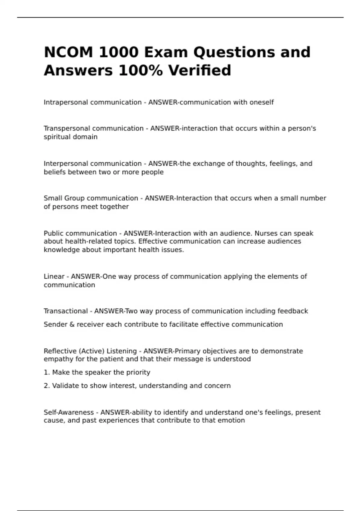 NCOM 1000 Exam Questions and Answers 100% VerifiedNCOM 1000 Exam Questions and Answers 100% VerifiedNCOM 1000 Exam Questions and Answers 100% VerifiedNCOM 1000 Exam Questions and Answers 100% Verified Intrapersonal communication - ANSWER-communication with oneself Transpersonal communication - ANSWER-interaction that occurs within a person's spiritual domain Interpersonal communication - ANSWER-the exchange of thoughts, feelings, and beliefs between two or more people Small Group communication - ANSWER-Interaction that occurs when a small number of persons meet together