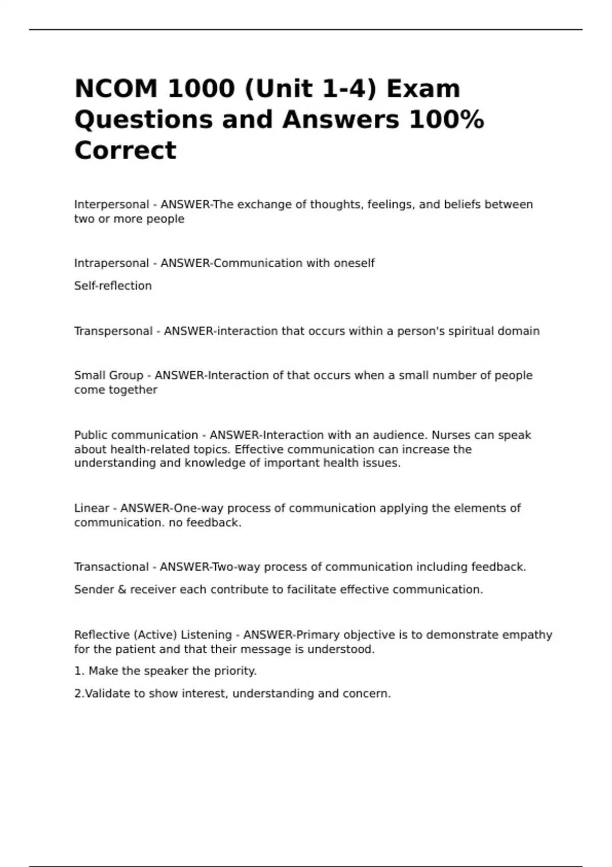 NCOM 1000 (Unit 1-4) Exam Questions and Answers 100% CorrectNCOM 1000 (Unit 1-4) Exam Questions and Answers 100% CorrectNCOM 1000 (Unit 1-4) Exam Questions and Answers 100% CorrectNCOM 1000 (Unit 1-4) Exam Questions and Answers 100% CorrectInterpersonal - ANSWER-The exchange of thoughts, feelings, and beliefs between two or more people Intrapersonal - ANSWER-Communication with oneself Self-reflection Transpersonal - ANSWER-interaction that occurs within a person's spiritual domain Small Group - ANSWER-Interaction of that occurs when a small number of people come together