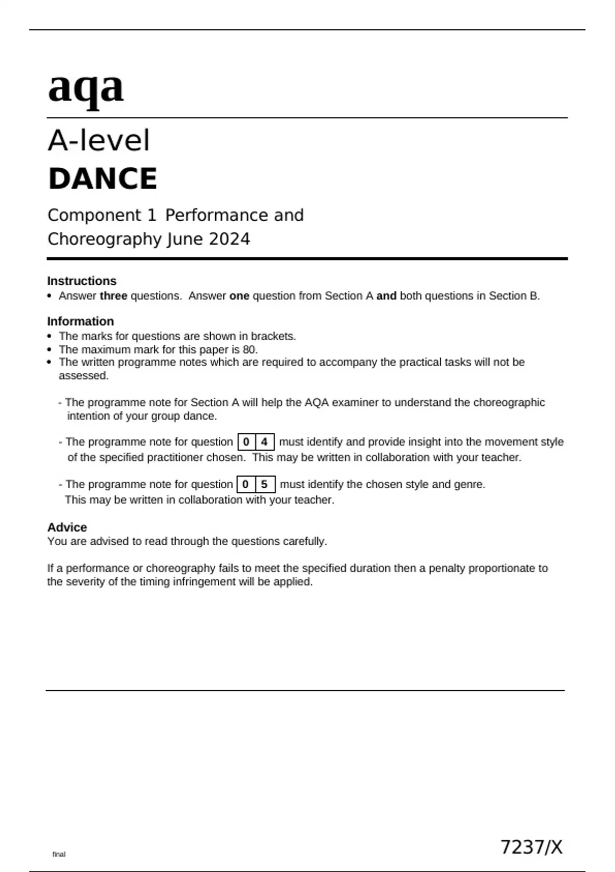 - The programme note for Section A will help the AQA examiner to understand the choreographic