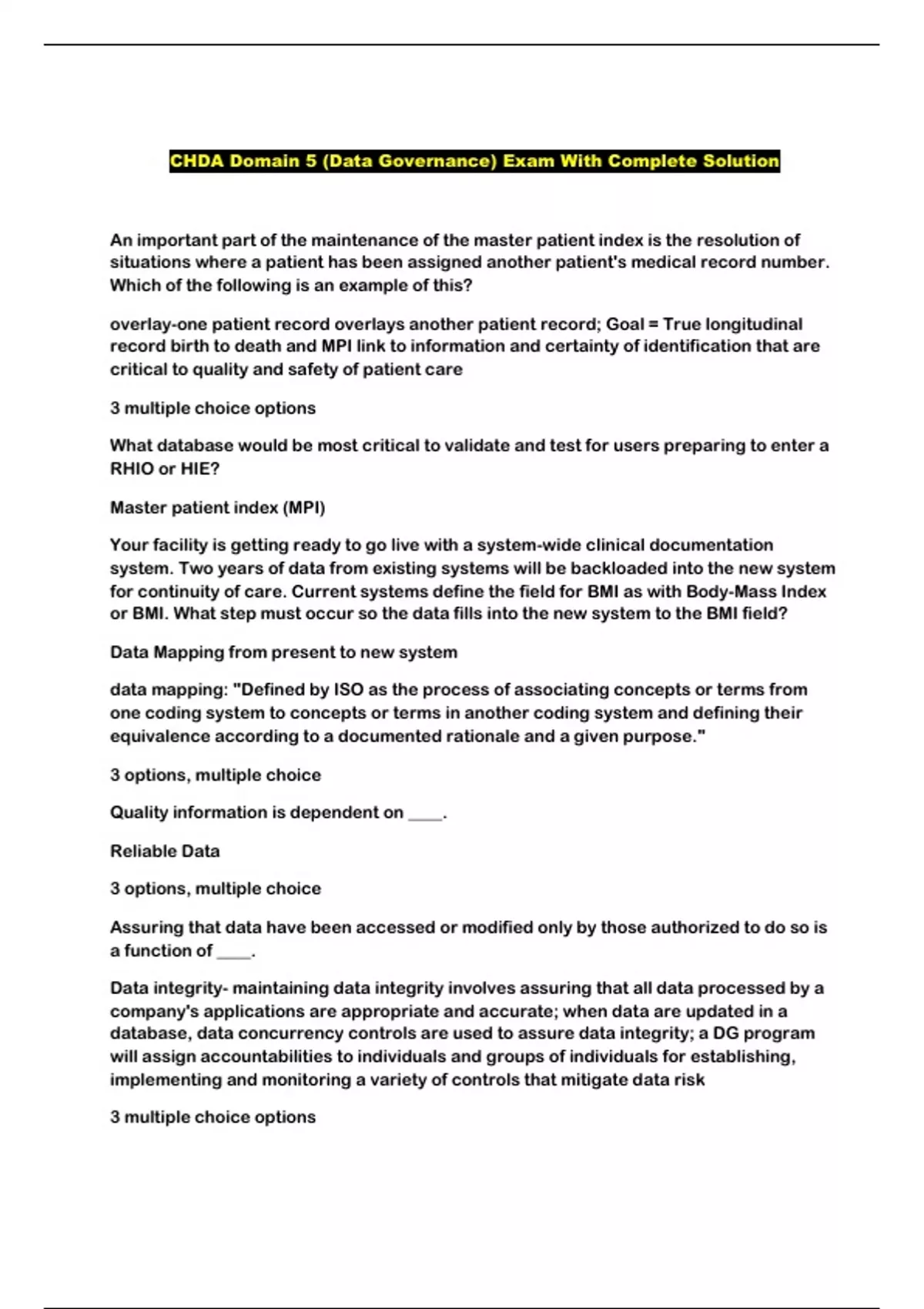 CHDA Domain 5 (Data Governance) Exam With Complete Solution...